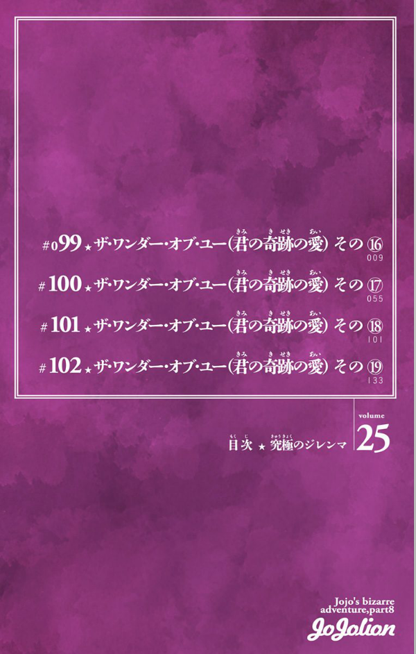 ジョジョリオン 26 - JOJOLION 26 透龍の忠告を無視し虹村京へ電話をかける康穂。しかし、10000m上空では一機の航空機から部品が康穂めがけて落下しようとしていた! 一方、定助は瀕死状態の豆銑が発した言葉「見えないヤツ」の意味に近づき…!?