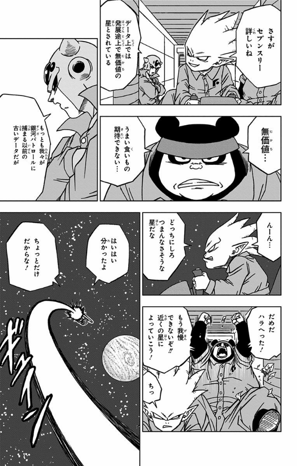 ドラゴンボール超 12 極悪人モロと、手下になった銀河刑務所の脱獄犯達は、生命力の高い星を求め、銀河を荒らしまわる!! そして地球にも、コピー能力を持つセブンスリーと銀河強盗団が現れる。悟空のいない中、苦戦するピッコロ達は!?