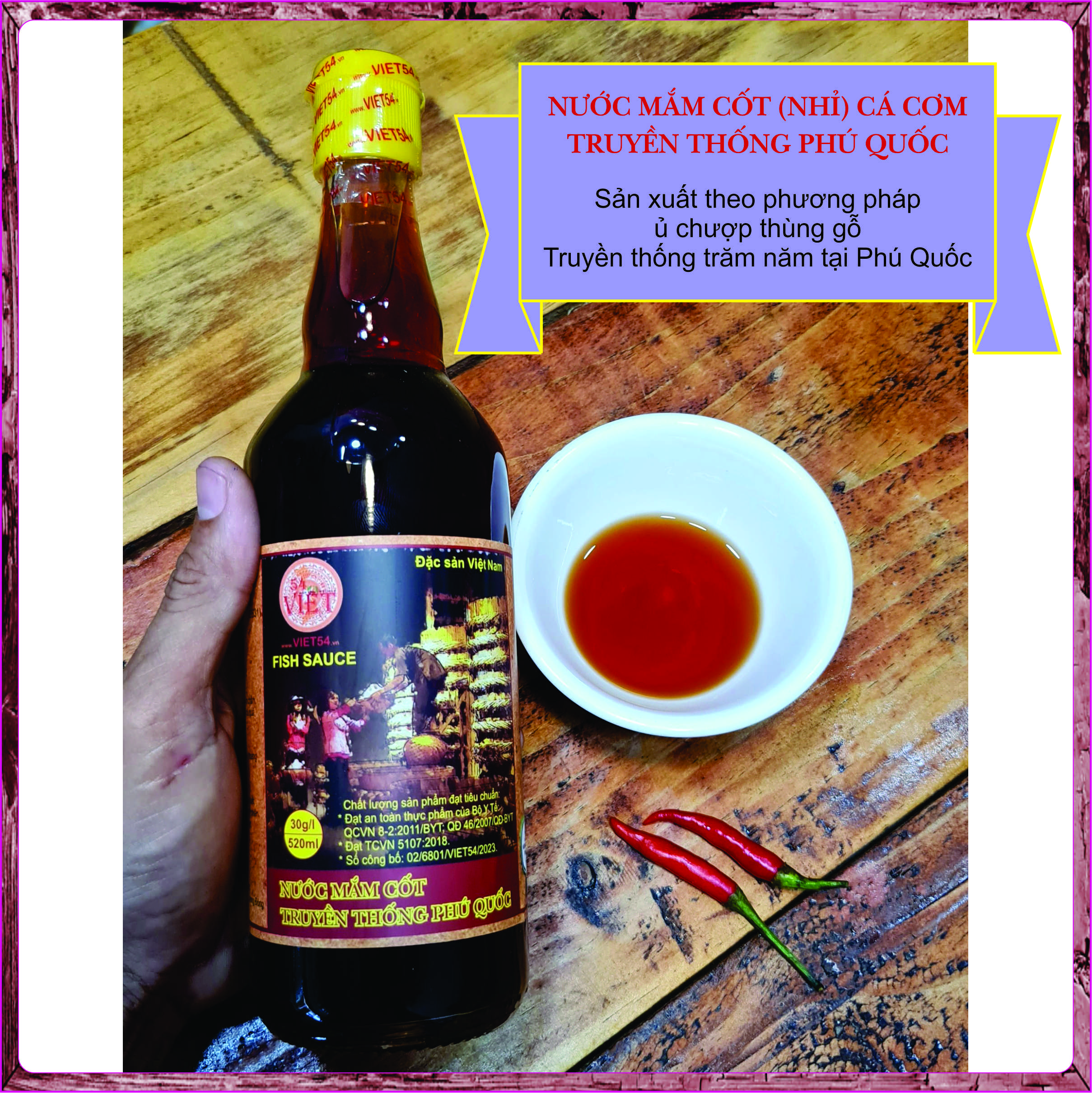 Sản phẩm chính hãng của Công ty VIỆT 54 - VIET 54. Nước mắm cốt 30 độ đạm, sản xuất theo phương pháp ủ chượp thùng gỗ truyền thống Phú Quốc – Đặc sản Việt