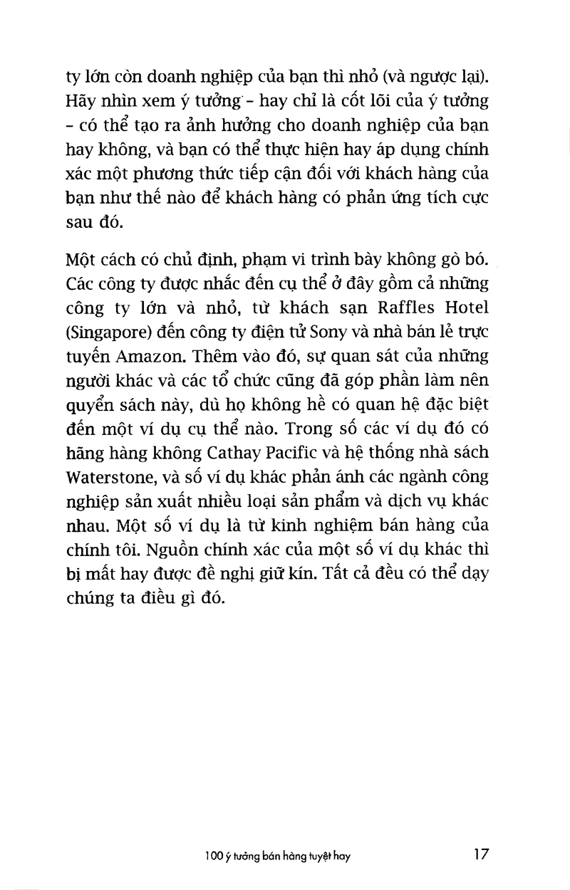 Cuốn sách là sự đúc kết của tác giả trong công việc tư vấn doanh nghiệp, cung cấp cho người đọc nhiều ví dụ từ thực tế làm ăn của những công ty có thật (có nêu danh lẫn ẩn danh) rất dễ để liên tưởng và suy ngẫm. Các ý tưởng trong sách được tác giả chọn lọc theo tiêu chí: phải mô tả được các phương thức tiếp cận có hiệu quả - thực hiện được - và cho thấy được cái nhìn sáng tạo và xây dựng về nghề bán hàng. Trọng tâm là bán hàng mặt đối mặt, cho dù người tiếp xúc trực tiếp với khách hàng là một thành viên của nhóm bán hàng trực tiếp hay một quản lý cấp cao tình cờ gặp gỡ khách hàng.