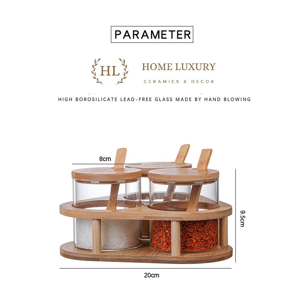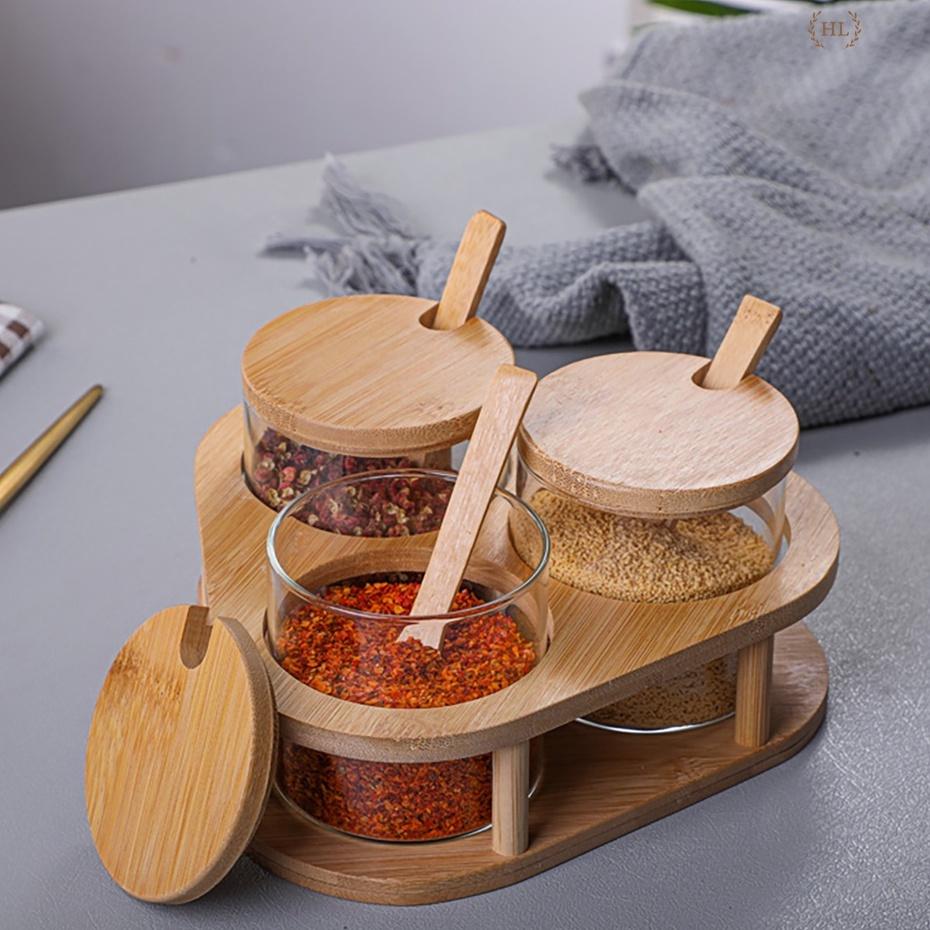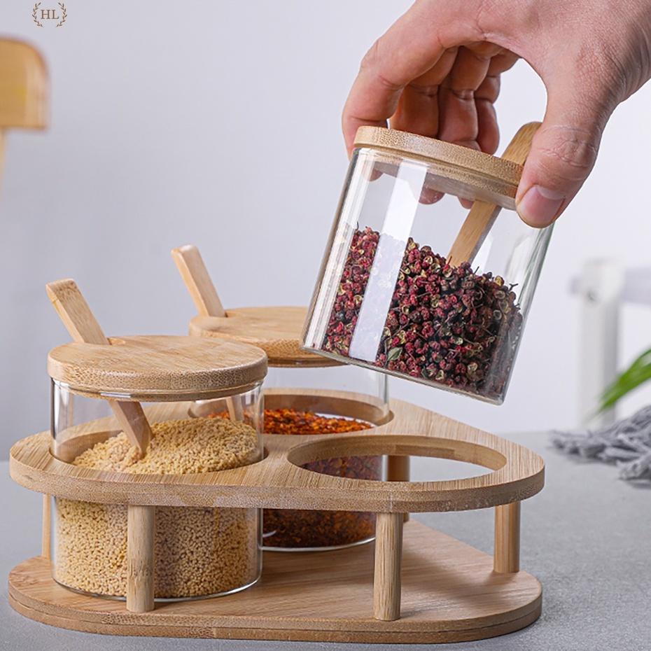 ✨3 HŨ THỦY TINH NẮP TRE | GIA VỊ THỦY TINH NẮP GỖ KÈM KỆ TAM GIÁC | HŨ THỦY TINH CAO CẤP ĐỰNG GIA VỊ KÈM KHAY VÀ THÌA GỖ