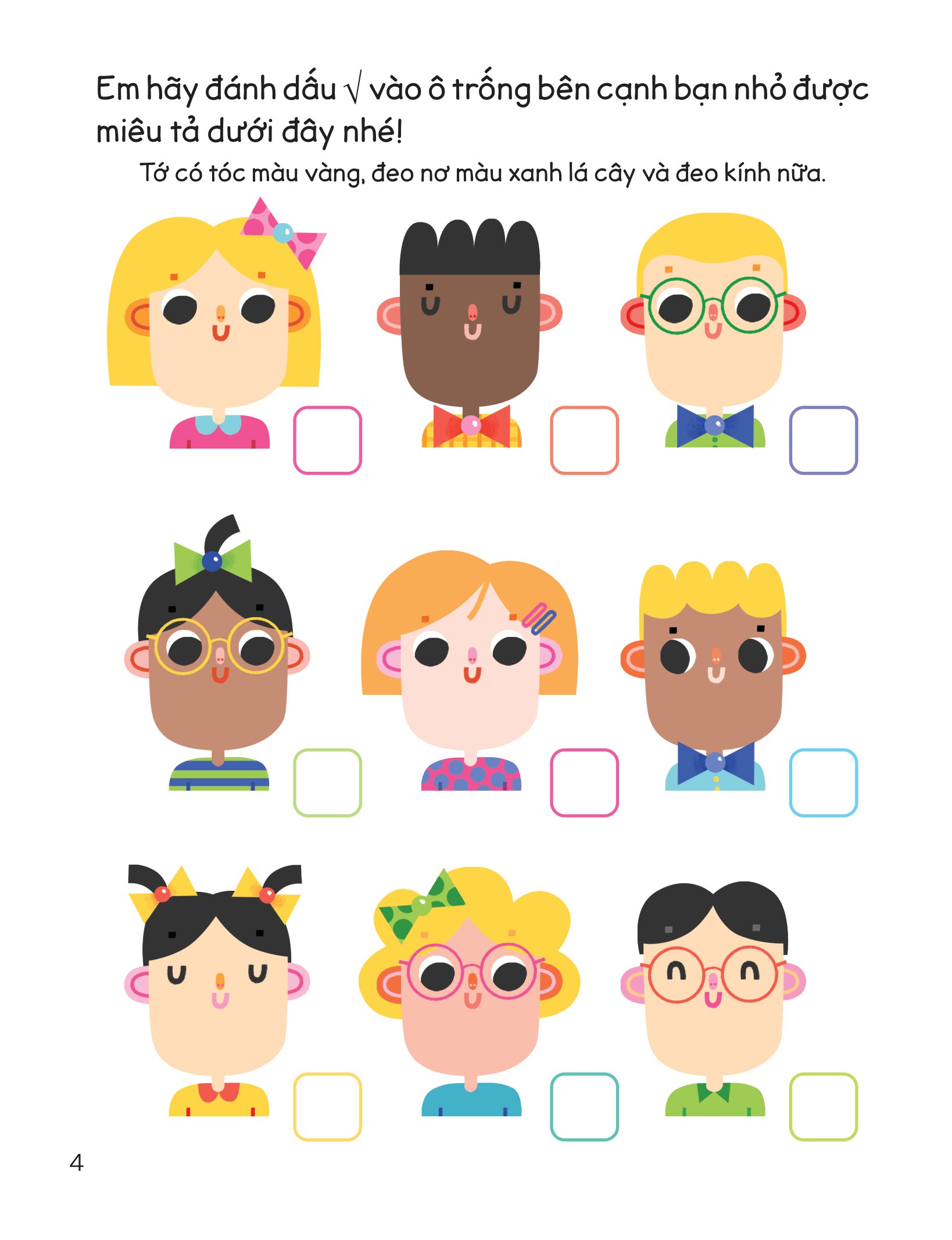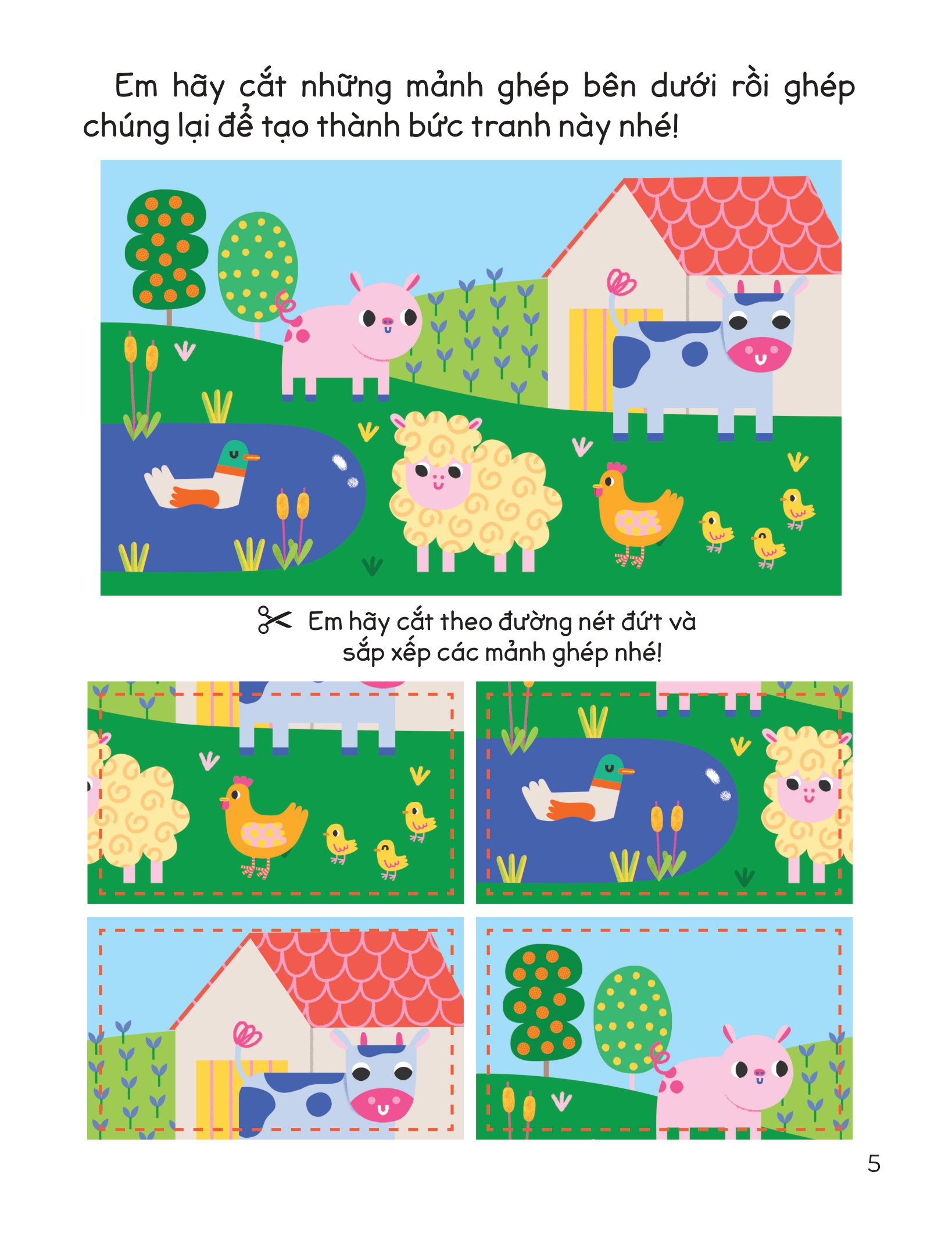 Đồng thời, các hoạt động trong sách cũng kích thích trí não của em, giúp em phát triển nhận thức thị giác, kỹ năng vận động tinh và sự phối hợp tay-mắt đấy.
