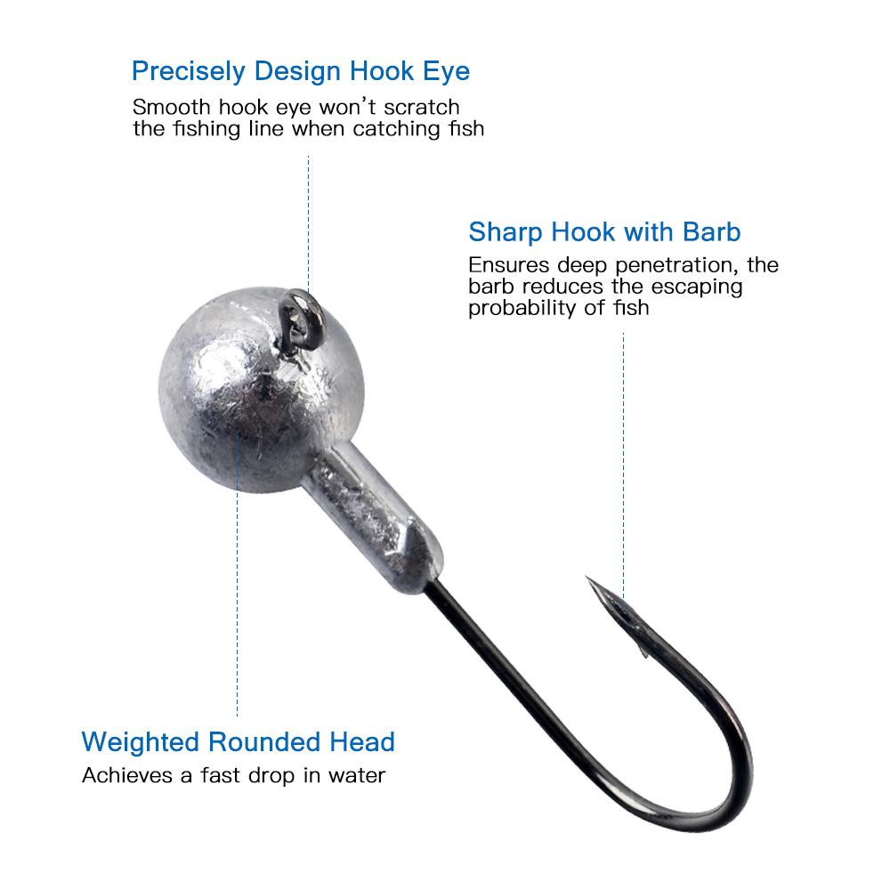 Features: High carbon steel jig, sharp hook for better penetration, solid and durable. Rigging with most soft worm and grub lures, keep soft lure in right position. Weighted rounded head designed for a fast drop