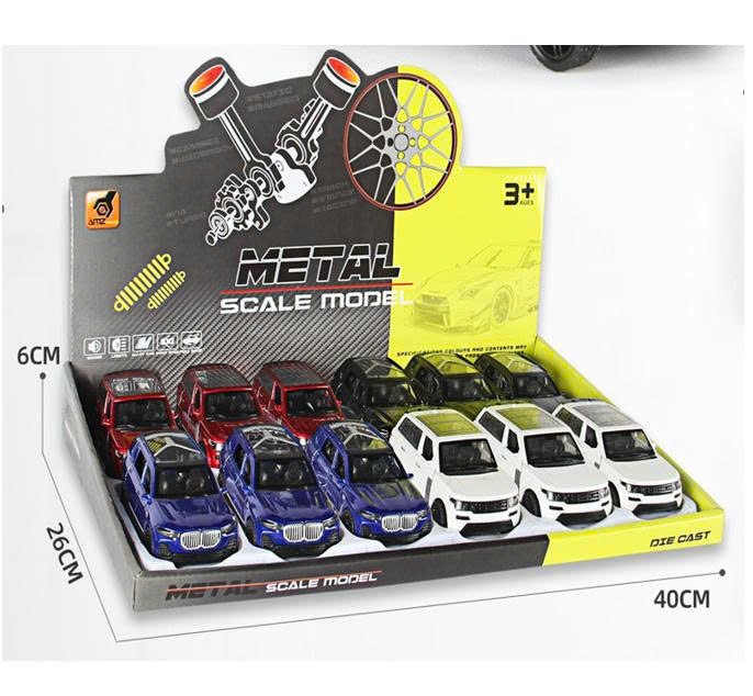 1087-8 – Mô hình ô tô sắt 12 xe/hộp (KT 7.3x2.7x2.5cm) Mô hình ô tô 1087-8 gồm 12 xe trong một hộp, với thiết kế mô phỏng nhiều kiểu dáng xe khác nhau. Kích thước