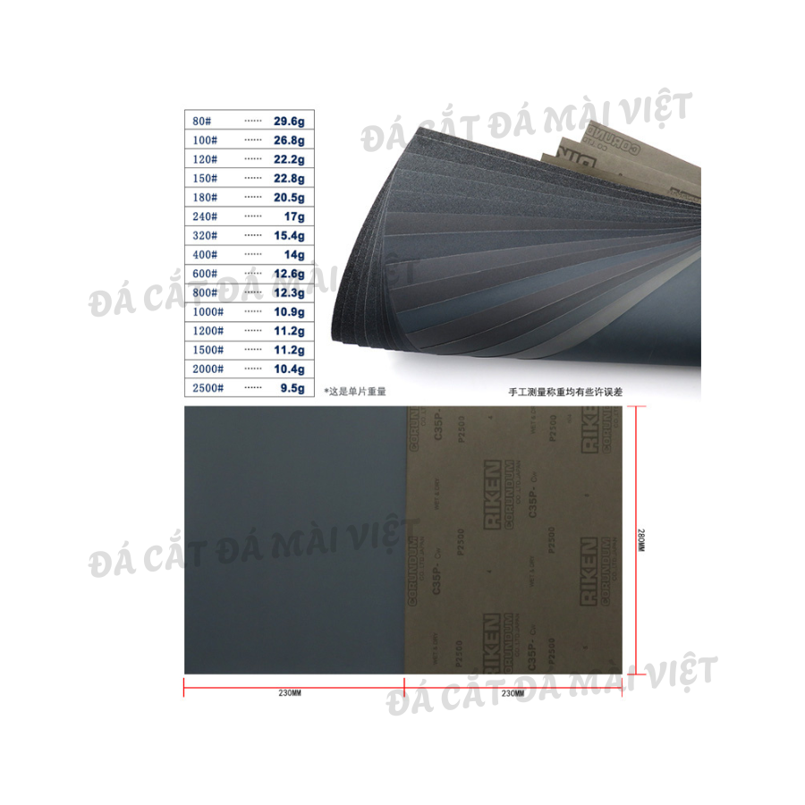 5 Tờ Giấy Nhám Nước RIKEN C35P Nhật Bản Đủ Số Từ P150 Đến P2500 Chính Hãng [THÔNG TIN SẢN PHẨM] Kích thước: 230x280mm, 9″x11″ Xuất xứ: Nhật Bản Độ nhám,độ mịn: + Combo 1: