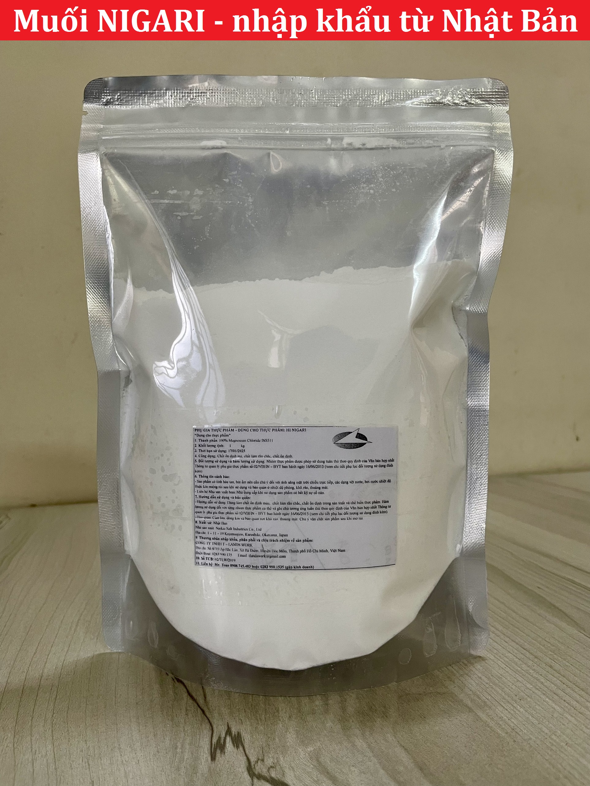 Thông tin về sản phẩm Tên thường gọi :Muối Nigari, muối Nhật, muối Nigari bột, muối làm đậu hũ Tên khoa học : MAGNESIUM CHLORIDE HEXAHYDRATE Thành phần : 100% Magnesi clorid (INS 511) Thành