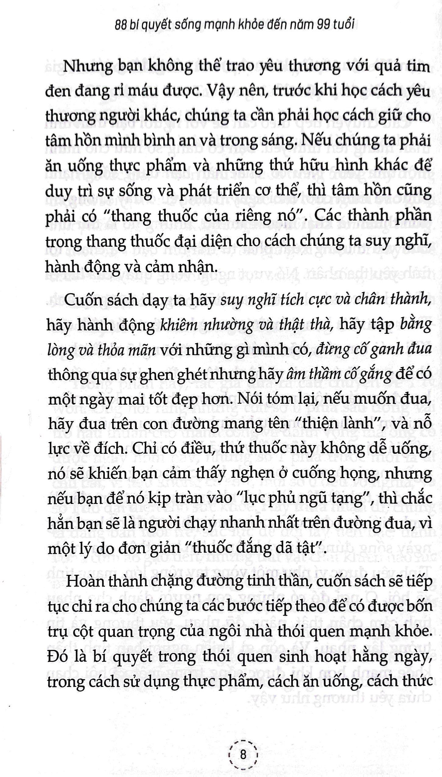 Nhưng bạn không thể trao yêu thương với quả tim đen đang rỉ máu được. Vậy nên, trước khi học biết yêu thương người khác, chúng ta cần phải học cách giữ cho tâm hồn mình bình an và trong sáng. Nếu người ta phải ăn uống thực phẩm và những thứ hữu hình khác để duy trì sự sống và phát triển cơ thể, thì tâm hồn cũng phải có “thang thuốc của riêng nó”. Các thành phần trong thang thuốc đại diện cho cách chúng ta suy nghĩ, hành động và cảm nhận. Cuốn sách dạy ta hãy suy nghĩ tích cực và chân thành, hãy hành động khiêm nhường và thật thà, hãy tập bằng lòng và thỏa mãn với những gì mình có, đừng cố ganh đua thông qua sự ghen ghét nhưng hãy âm thầm cố gắng để có một ngày mai tốt đẹp hơn. Nói tóm lại, nếu muốn đua, hãy đua trên con đường mang tên “thiện lành”, và nỗ lực về đích. Chỉ có điều, thứ thuốc này không dễ uống, nó sẽ khiến bạn cảm thấy nghẹn ở cuống họng, nhưng nếu bạn để nó kịp tràn vào “lục phủ ngũ tạng”, thì chắc hẳn bạn sẽ là người chạy nhanh nhất trên đường đua, vì một lý do đơn giản “thuốc đắng dã tật”. Hoàn thành chặng đường tinh thần, cuốn sách sẽ tiếp tục chỉ ra cho chúng ta các bước tiếp theo để có được bốn trụ cột quan trọng của ngôi nhà thói quen mạnh khỏe. Đó là bí quyết trong thói quen sinh hoạt hằng ngày, trong cách sử dụng thực phẩm, cách ăn uống, cách thức vận động cơ thể để bạn có thể “tu luyện” thành công bí kíp sống khỏe mạnh đến năm 99 tuổi.