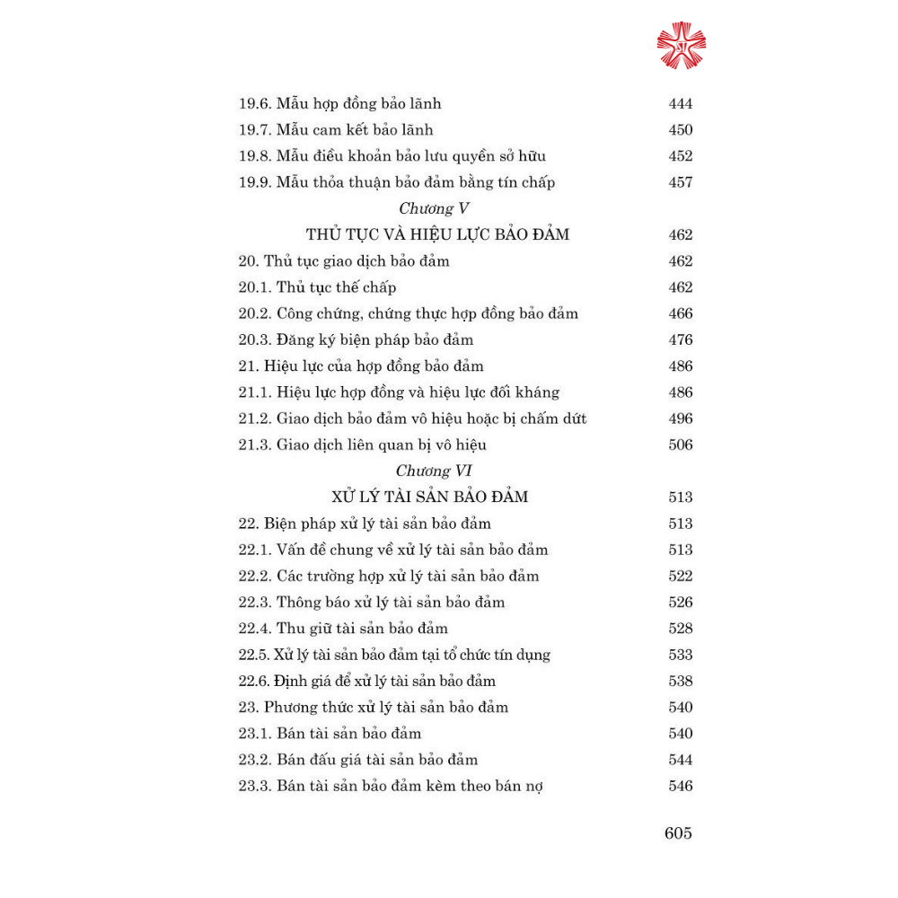 Cuốn sách gồm 101 tiểu mục, 24 mục, 6 chương (Giao dịch bảo đảm và tài sản bảo đảm; Các biện pháp bảo đảm; Điều kiện bảo đảm; Hợp đồng bảo đảm; Thủ tục và hiệu lực bảo đảm; Xử lý tài sản bảo đảm) được trình bày một cách hệ thống, đầy đủ, rõ ràng về mọi vấn đề, từ lý giải về các quy định pháp luật và liên hệ thực tế cho đến thiết kế các mẫu hợp đồng bảo đảm.