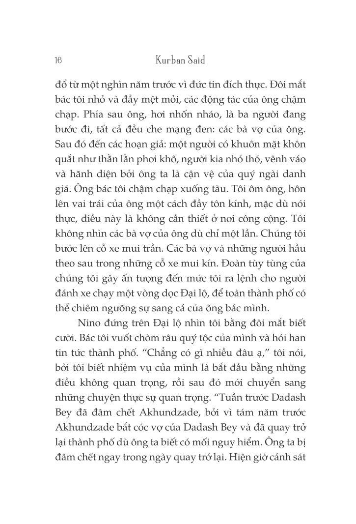 Hẳn nhiều người sẽ đoán, bằng vào cái tên, rằng đây là một câu chuyện tình. Phải, Ali và Nino: mối tình thanh mai trúc mã giữa hai cô cậu học trò nơi thành Baku cổ kính của đất nước Azerbaijan. Ali và Nino: đôi tình nhân ngang trái bị ràng buộc bởi hai tôn giáo, hai sắc tộc, chỉ có thể đến với nhau bằng cách trả những món nợ máu.
