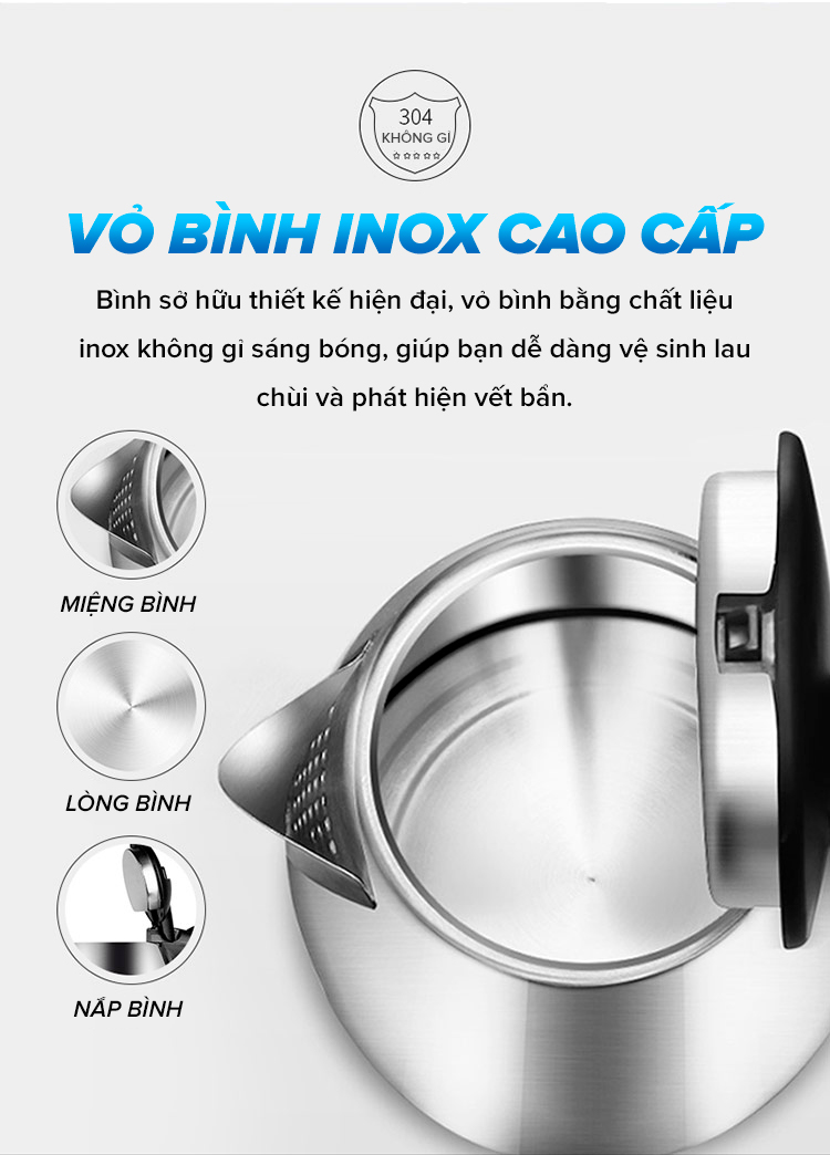 Bình đun siêu tốc thiết kế hiện đại, đun nước nhanh với công suất lớn Chất liệu ruột bình inox SUS 304 cao cấp cho cảm giác sang trọng, chống bám bẩn, dễ dàng vệ