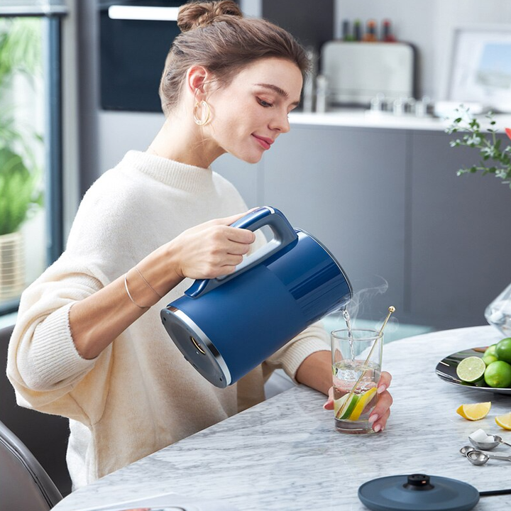 Dung tích: 1.7L Công suất: 1800W Ưu điểm nổi bật: 2 lớp cách nhiệt: Thép không gỉ bên trong, nhựa mát tay bên ngoài – an toàn tuyệt đối, nhất là với gia đình có