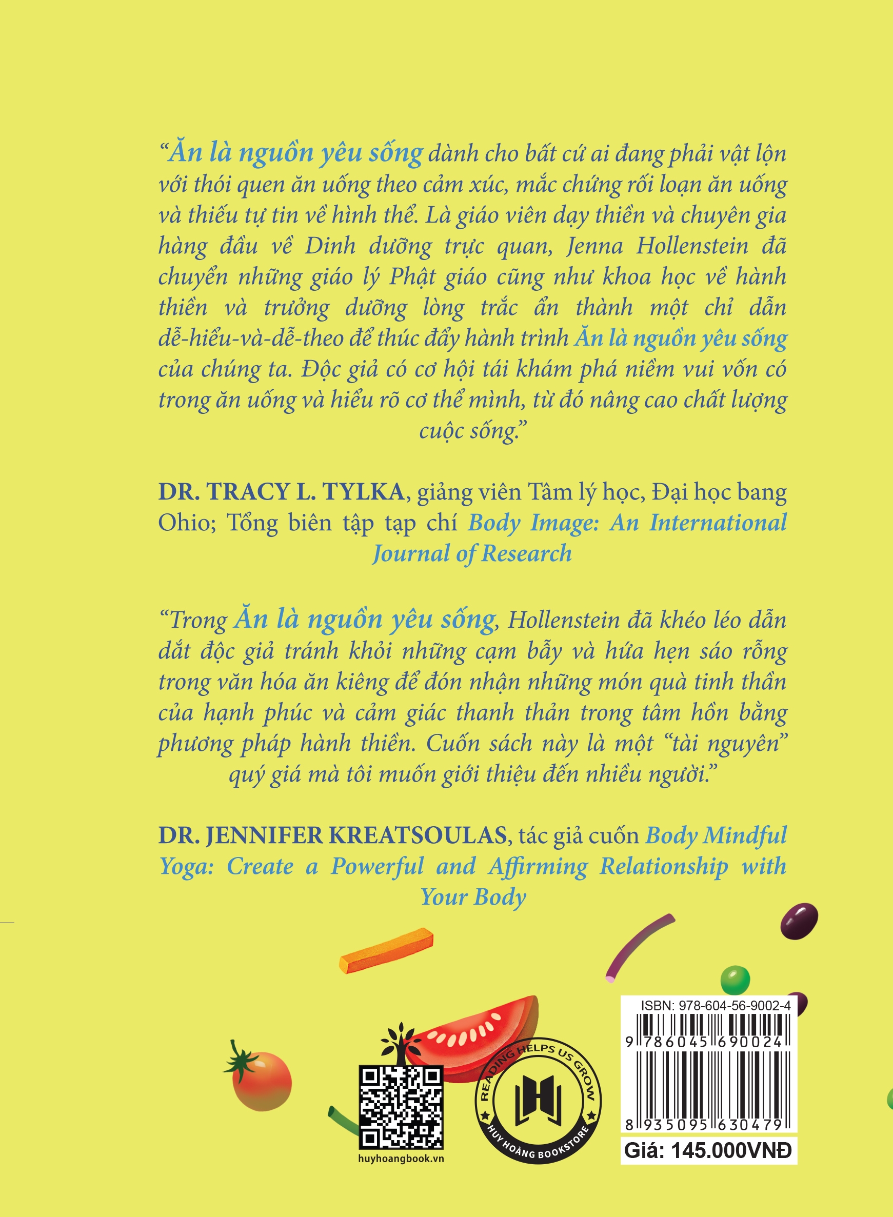 Ăn Là Nguồn Yêu Sống Ăn là nguồn yêu sống dành cho vấ cứ ai đang phải vật lộn với thói quen ăn uống theo cảm xúc, mắc chứng rối loạn ăn uống và thiếu tự tin về hình thể. Là giáo viên dạy thiền và chuyên gia hàng đầu về Dinh dưỡng trực quan, Jenna Hollenstein đã chuyển những giáo lý Phật giáo cũng như khoa học về hành thiền và trưởng dưỡng lòng trắc ẩn thành một chỉ dẫn dễ-hiểu-và-dễ-theo để thúc đẩy hành trình Ăn là nguồn yêu sống của chúng ta. II.THÔNG TIN CHI TIẾT