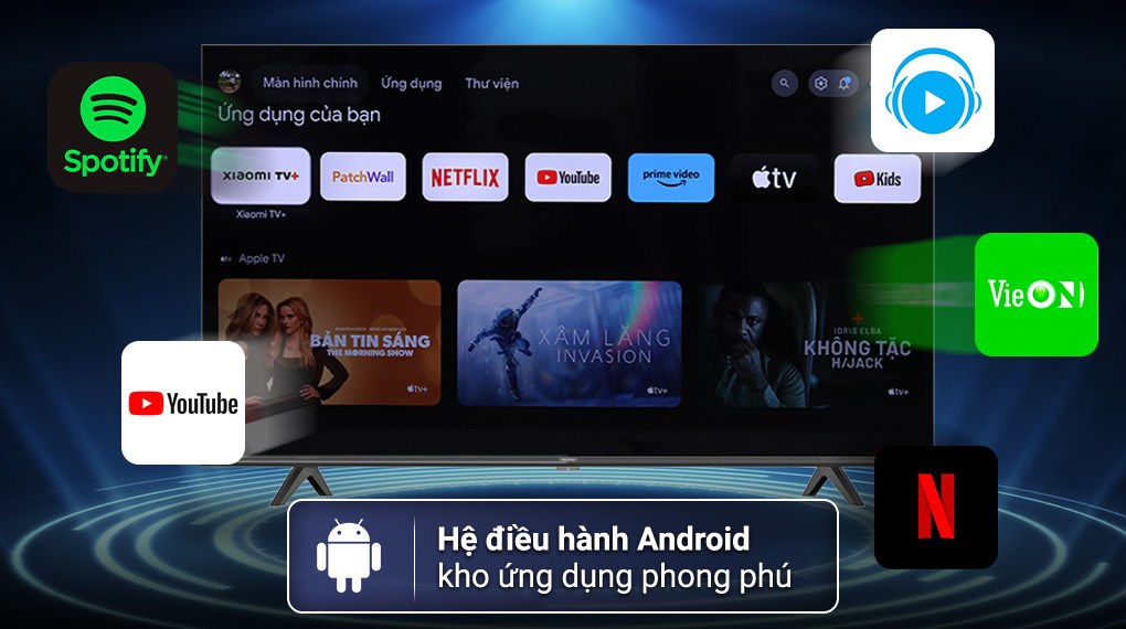 - Hệ điều hành Android TV tích hợp kho ứng dụng giải trí đa dạng thể loại, phong phú nội dung như YouTube, Netflix để bạn có thể thưởng thức mỗi ngày.