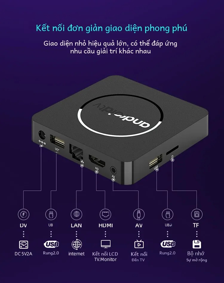 ** Cổng kết nối - 01 Cổng HDMI - 01 Cổng AV - 01 Cổng Optical - 02 CổngcUSB 2.0, USB 3.0 - 01 khe cắm thẻ nhớ ** Đặc điểm của Android Tivi Box