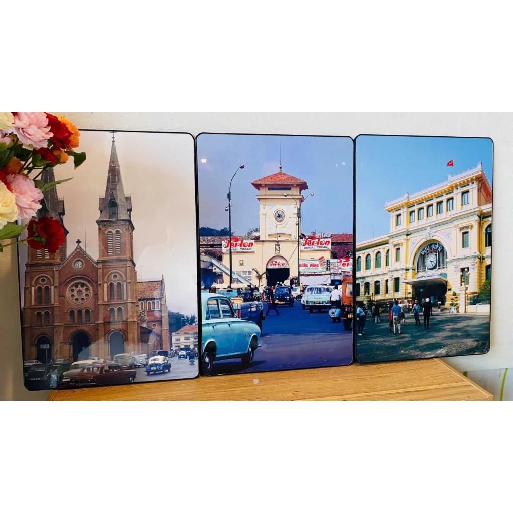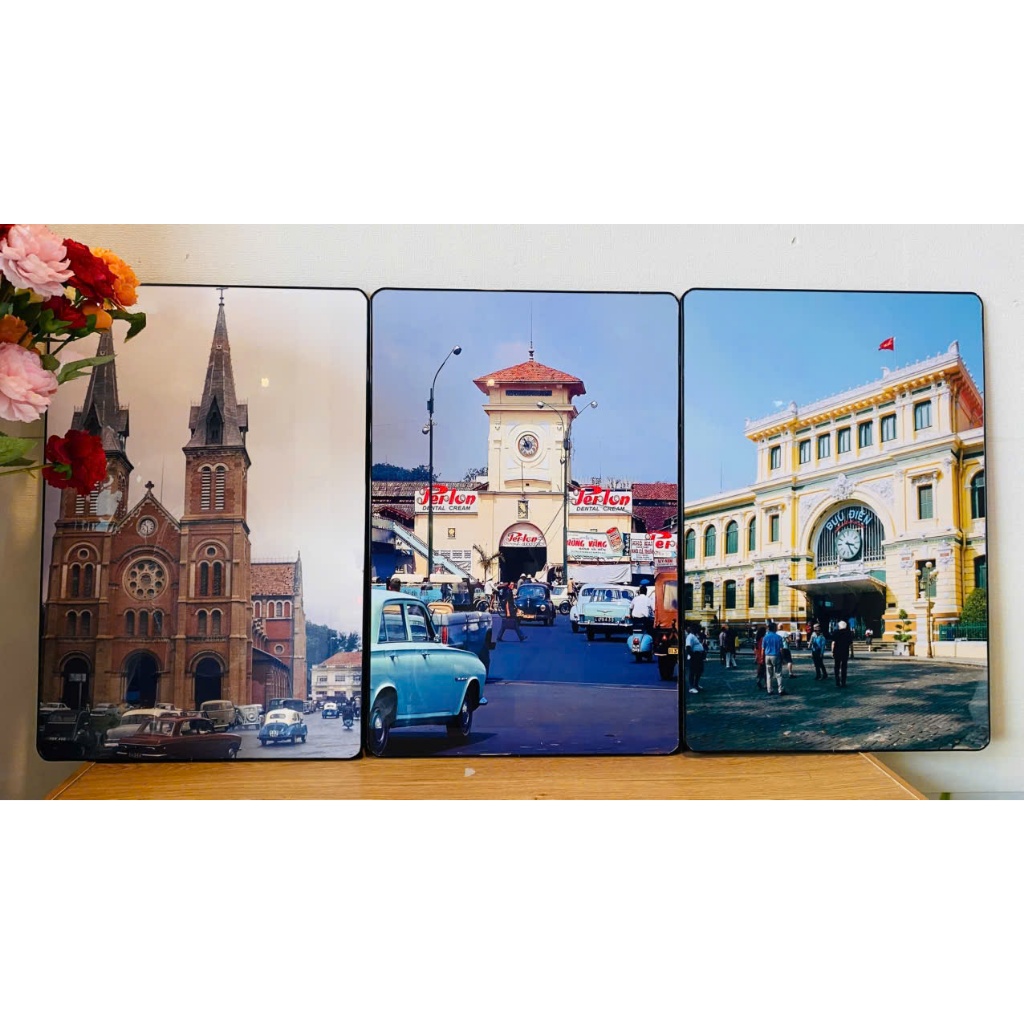 Tranh treo tường cảnh sài gòn - Kích thước của tranh : Kích thước : Size 1: 30x45cmx2 tấm+45x65cmx1 tấm Size 2: 40x60cmx2 tấm + 60x80x1 tấm) Size 3:50x70cmx2 tấm + 70x90x1 tấm) - Chất