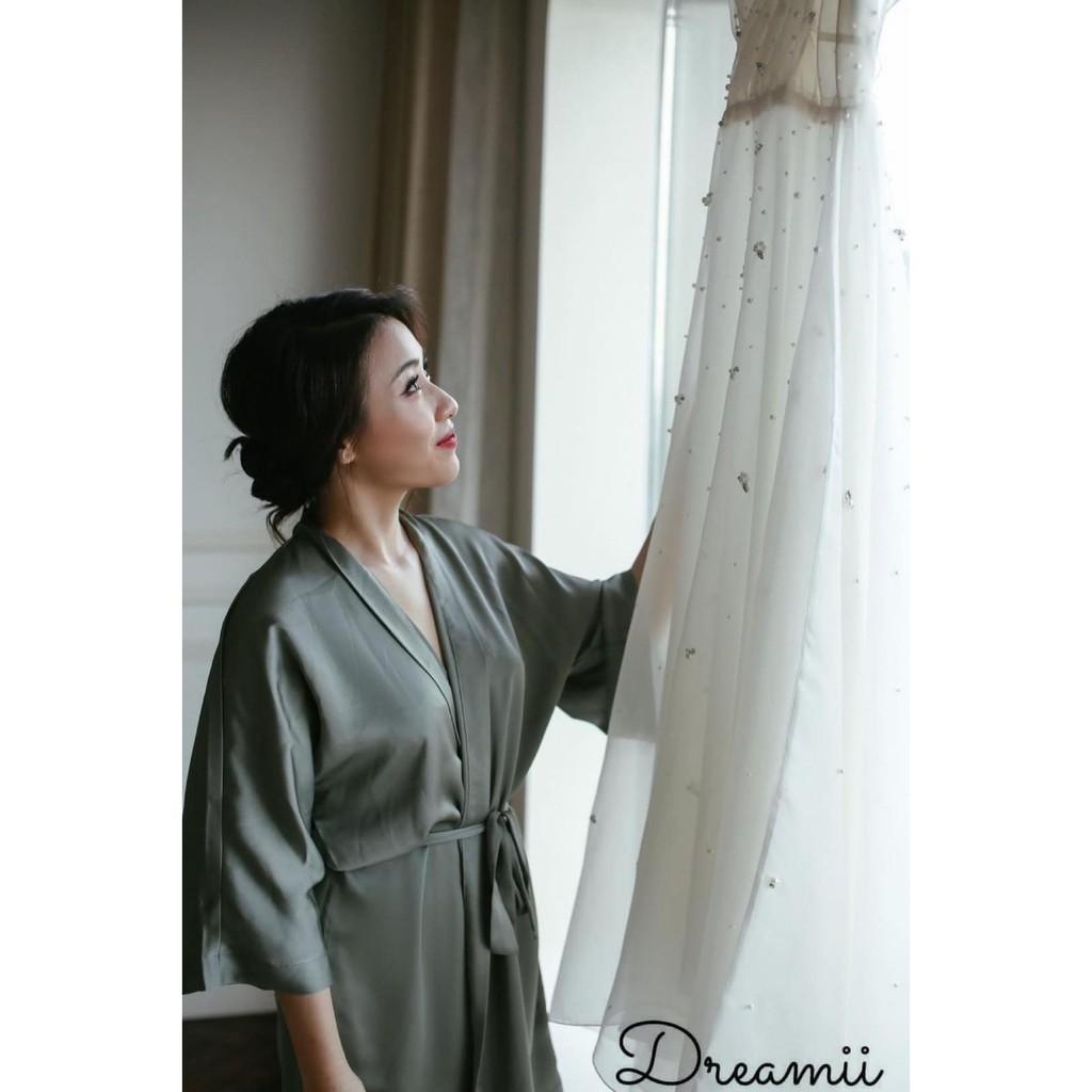 Bộ choàng đơn giản màu xanh Bên cạnh việc sử dụng chất liệu lụa satin, còn điểm xuyết chi tiết thêu ren trong hầu hết các mẫu thiết kế, để giúp người mặc khoe trọn