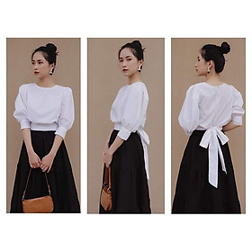 Áo sơ mi nữ cổ tròn nhún bèo thắt nơ tay kiểu