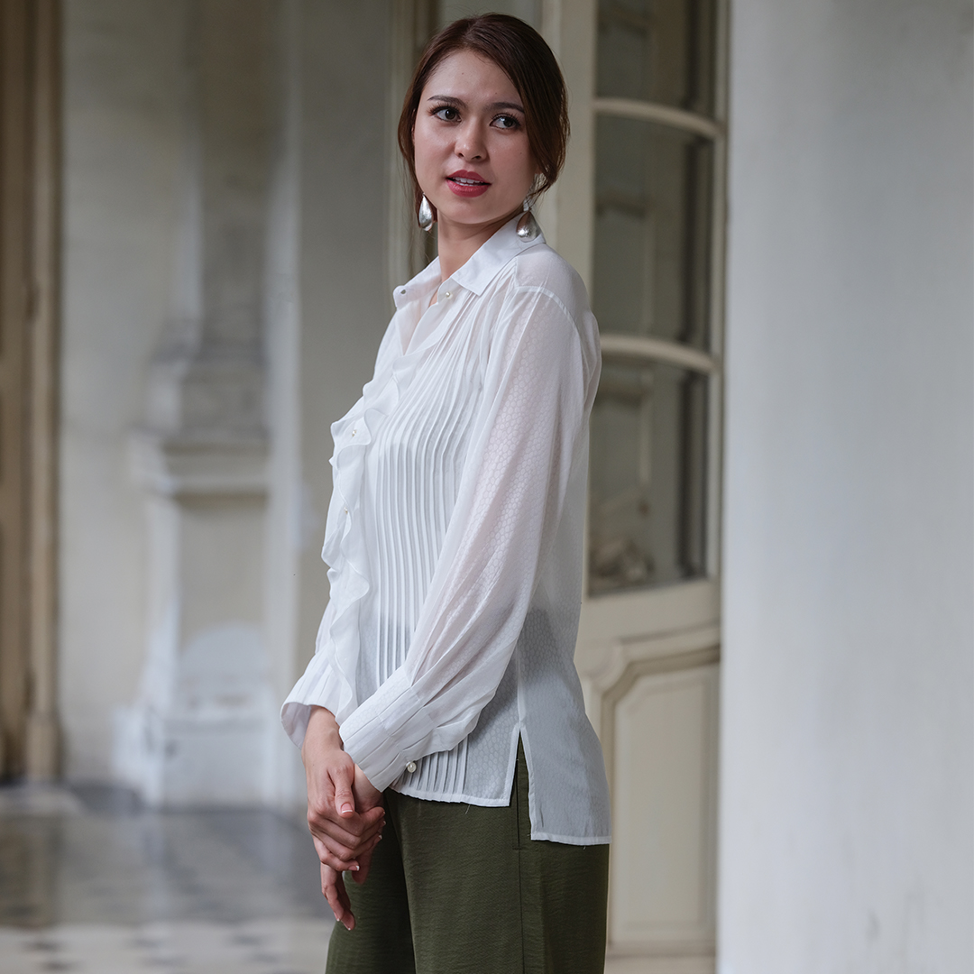 Các chi tiết ép ly dọc thân trước, trên cổ tay mang lại điểm nhấn vô cùng đặc biệt cho chiếc áo sơ mi. Cộng thêm chi tiết bèo chạy dọc hàng nút ngọc trai sang trọng, chiếc áo sơ mi kiểu thực sự được Hity thổi hồn quý phái một cách tài tình.