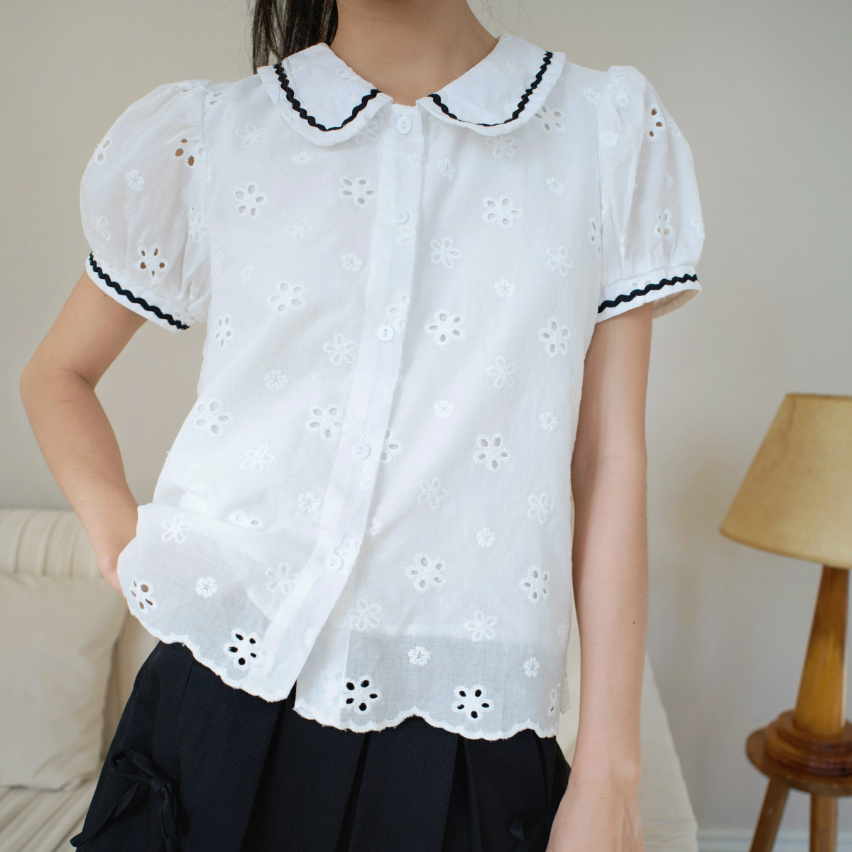 CHI TIẾT SẢN PHẨM ✿ Sản phẩm : Áo sơ mi tay ngắn viền ren dễ thương nữ tính cột nơ sau dễ phối đồ Jenni Miều Est.2013 ✿ Chất liệu : Xô Ren ✿