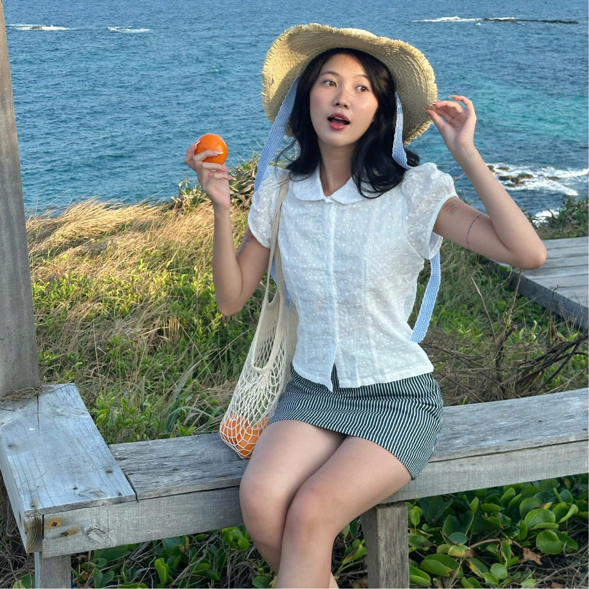 Áo sơ mi cổ sen tay ngắn xinh xắn Mô tả Size S: sản phẩm vòng eo rộng 64cm - 66cm, vòng ngực rộng 84cm-86cm, vòng mông rộng 86cm-88cm Size M: sản phẩm vòng eo
