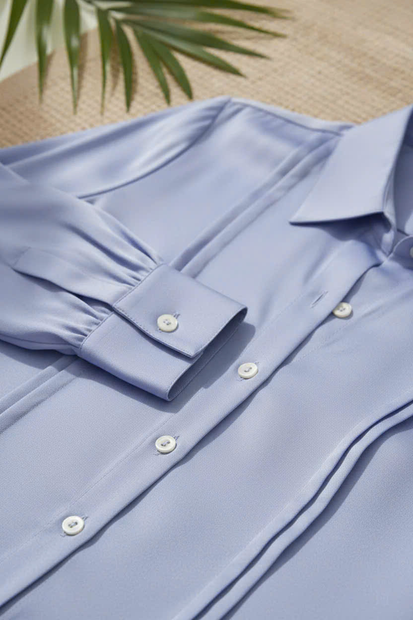 Nghệ nhân cắt may: Local Made Trong nhịp sống hiện đại, vẻ đẹp đích thực không nằm ở sự cầu kỳ, mà ở sự tự tại và thanh lịch không cố gắng (effortless elegance). Chiếc Áo sơ mi sinh ra để tôn vinh tinh thần ấy. Hãy tưởng tượng bạn đang sải bước trên hiên resort, dưới tán lá cọ xanh mướt, ánh hoàng hôn vàng óng ươm lên làn da và chất vải nhẹ nhàng màu xanh da trời thanh cao. Chiếc áo Thanh Lâm nhẹ nhàng bay lượn theo từng cơn gió nhiệt đới, mang đến cảm giác thư thái tuyệt đối. Chiếc áo sơ mi này là sự kết hợp hoàn hảo giữa phom dáng công sở truyền thống và chất liệu lụa cao cấp: