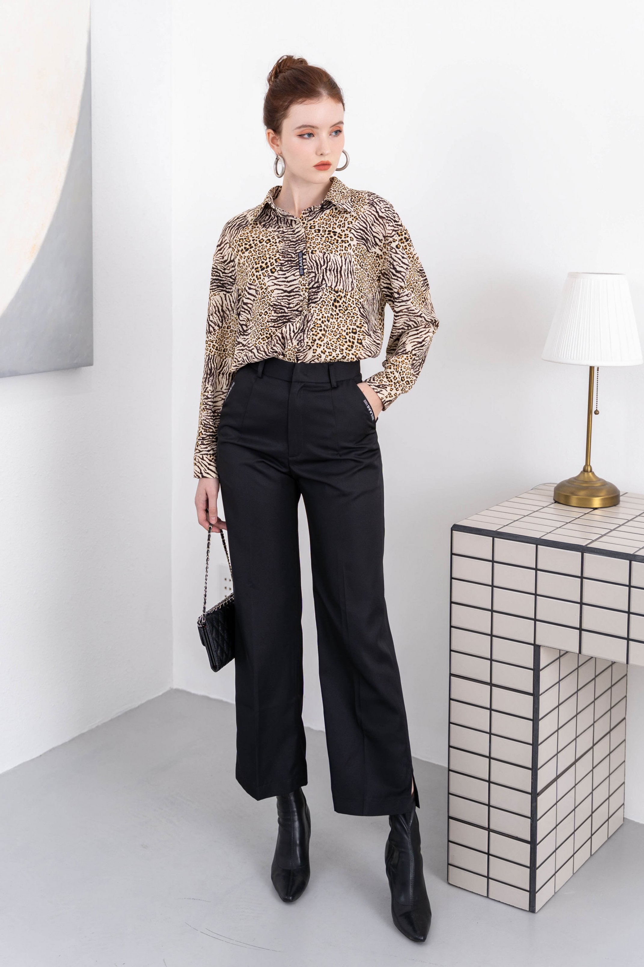 - Chất liệu: Vải chiffon phối lụa cát HQ - Thiết kế áo sơmi lụa voan đen xuyên thấu phối cùng hoạ tiết da beo tạo điểm nhấn, mang lại diện mạo quyến rũ và