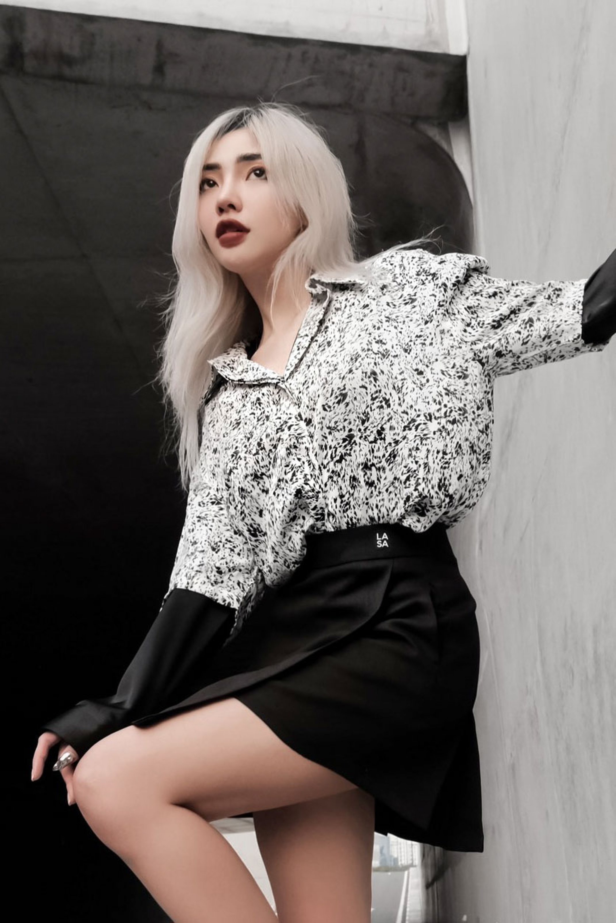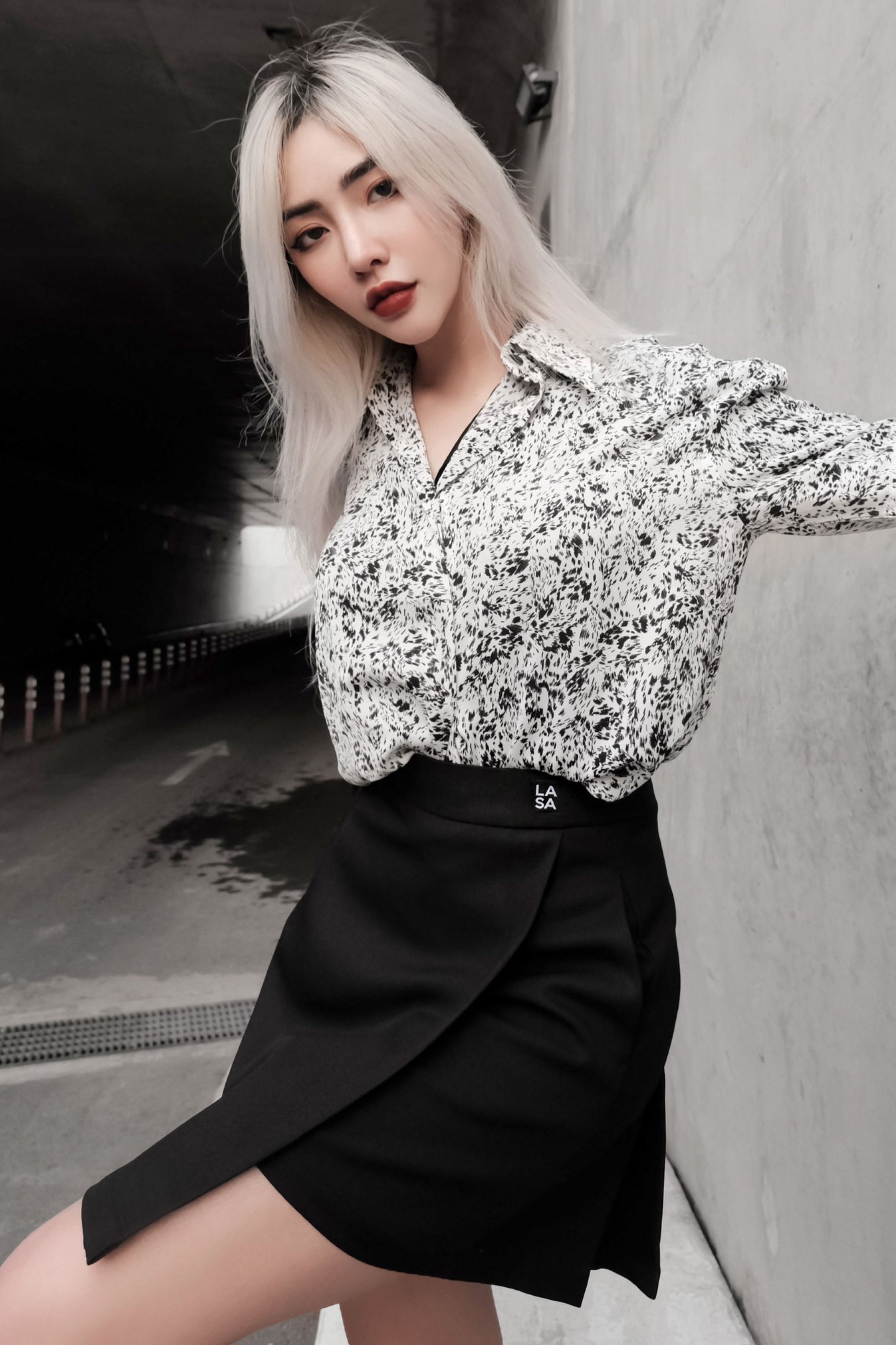 CHẤT LIỆU MANGO, MỀM MƯỢT, KHÔNG NHĂN ÁO MÀU TRẮNG, HOẠ TIẾT MÀU ĐEN ÁO SOMI NẸP GIẤU NÚT FORM RỘNG FREESIZE ĐIỂM NHẤN 1 BÊN TAY PHẢI ÁO GẮN TAG LOGO LAAS