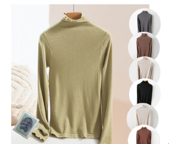 Áo giữ nhiệt nữ cổ lọ cao, sợi len mềm mại, đàn hồi tốt, ôm lấy thân hình, rất gợi cảm và nữ tính.