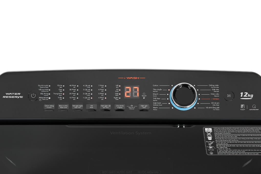 - Kiểu động cơ: , nhãn năng lượng chuẩn 5 sao, hiệu suất sử dụng điện là 11.5 Wh/kg. Hình ảnh chỉ mang tính chất minh họa Tiện ích - : Giúp bạn chủ động thời gian giặt giũ của mình, phù hợp cho những người bận rộn. - : Khóa các phím chức năng, hạn chế trẻ em đùa nghịch hoặc thao tác sai trên bảng điều khiển. Hình ảnh chỉ mang tính chất minh họa với khối lượng giặt tối đa lên đến 12 kg, máy sẽ là sự lựa chọn thích hợp cho các gia đình có đông thành viên (trên 7 người). Ngoài ra, mâm giặt kép có lực xoáy nước mạnh mẽ, giúp đảo trộn quần áo tốt hơn, nâng cao hiệu quả giặt sạch.