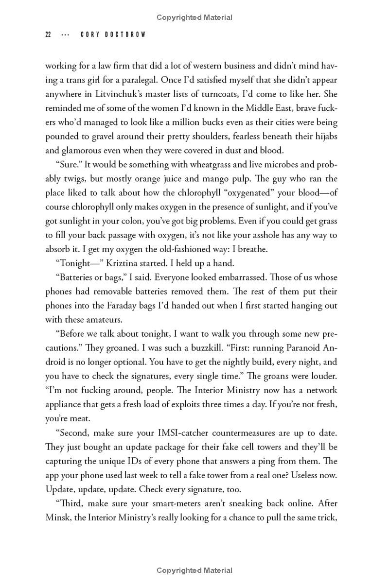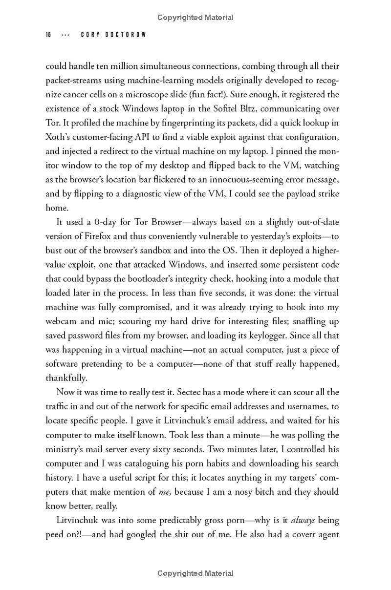 Masha works for Xoth Intelligence, an InfoSec company upgrading the Slovstakian Interior Ministry's ability to spy on its citizens' telecommunications with state-of-the-art software (at least, as state-of-the-art as Xoth is prepared to offer in its middle-upper pricing tier).