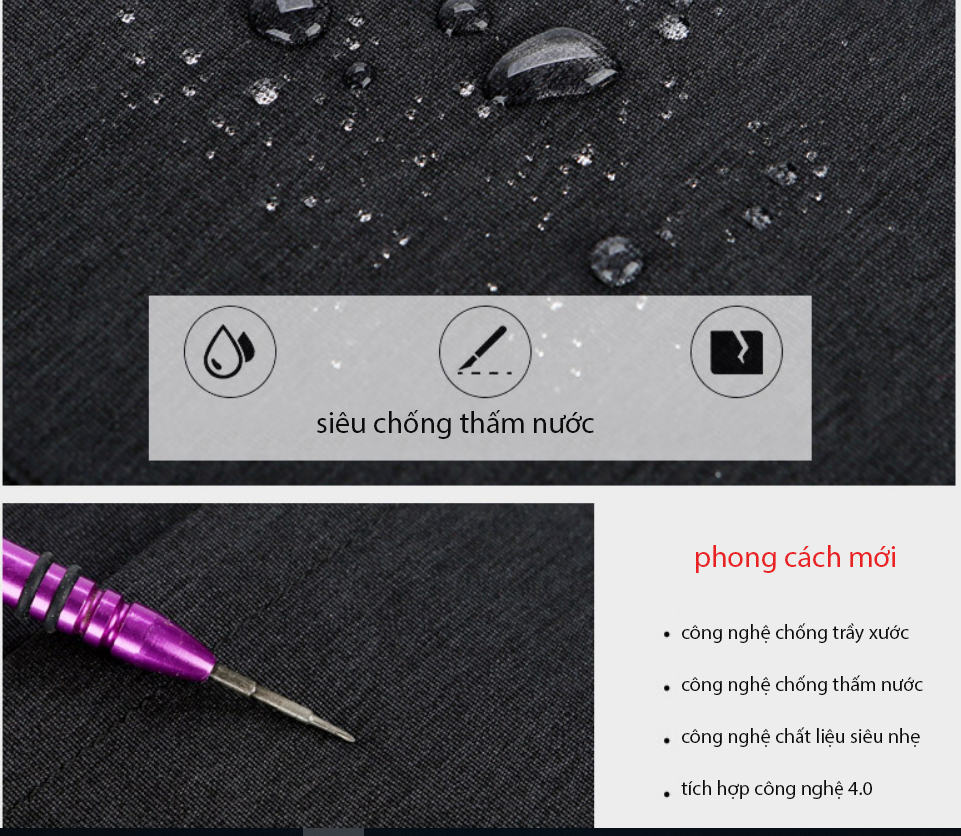 Mua tại TiktokKích thước : rộng 29cm ,cao 44cm,dày 24cm Phương pháp sản xuất: công nghệ cao Chất liệu : Màng chống thấm nylon được mã hóa SIÊU CHỐNG THẤM NƯỚC Chức năng: Không thấm nước, thoáng khí, chống mài mòn, làm sáng, chống sốc,sạc usb tiện dụng thiết kế : hiện đại,trẻ trung ,sang trọng