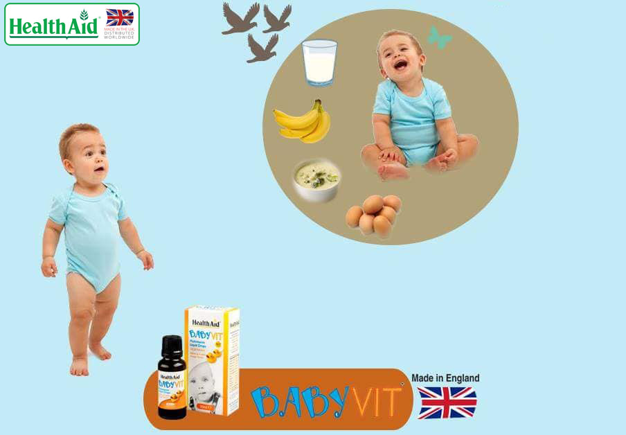 - Một số thành phần trong HealthAid Babyvit cung cấp các lợi ích sau: Vitamin A - Góp phần chuyển hóa sắt bình thường và duy trì chức năng của da, thị lực và miễn dịch bình thường Vitamin D - Góp phần hấp thụ / sử dụng canxi bình thường và duy trì chức năng cơ và xương bình thường Vitamin C - Góp phần hình thành collagen bình thường cho chức năng bình thường của nướu, da, răng, xương và sụn Thiamine (Vitamin B1) - Góp phần hoạt động bình thường của tim và chức năng tâm lý bình thường Riboflavin (Vitamin B2) - Góp phần duy trì màng nhầy và hồng cầu bình thường Nicotinamide (Vitamin B3) - Hoạt động với B1 & B2 để giải phóng năng lượng từ carbohydrate Axit Folic - Cần thiết cho sự nhân lên và phát triển của tế bào, giúp xây dựng các khối DNA & RNA, cũng như tổng hợp protein trong tất cả các tế bào Cách dùng: Babyvit drop được dùng hàng ngày. Có thể trộn vào sữa, nước hoa quả hoặc thức ăn thường dùng của trẻ. Lắc đều trước khi sử dụng.