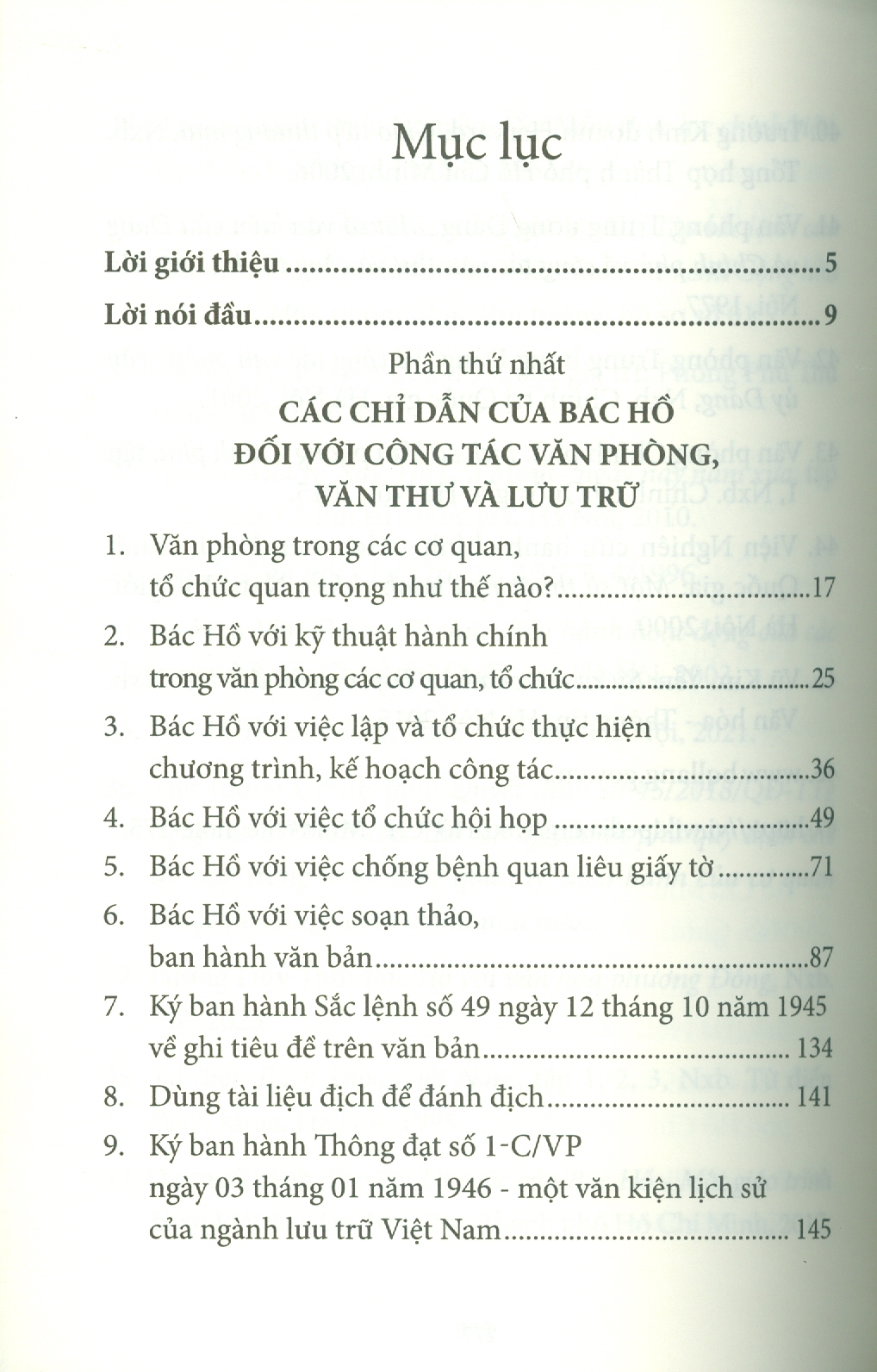 Phần thứ hai là tập hợp một số bài viết của Bác Hồ có liên quan đến công tác văn phòng, văn thư và lưu trữ như: óc tổ chức công việc trong hoạt động của Ủy ban nhân dân các cấp, về chống thói ba hoa, bệnh quan liêu, nạn giấy tờ, về cần kiệm liêm chính… Bác Hồ nói những điều đó trong nhiều hoàn cảnh lịch sử khác nhau nhưng đến tận ngày nay vẫn còn nguyên giá trị thời sự, nhất là khi công cuộc cải cách nền hành chính ở nước ta đang được đẩy mạnh để làm cho hoạt động quản lý nhà nước hiệu quả hơn. Bằng cách dẫn ra những lời nhắc nhở của Bác Hồ và những thành tựu nghiên cứu của nhiều nhà khoa học về công việc văn phòng, tác giả đã giúp người đọc hiểu một cách đầy đủ hơn về những công việc thầm lặng, nhưng rất có ý nghĩa thuộc lĩnh vực văn phòng, văn thư và lưu trữ.