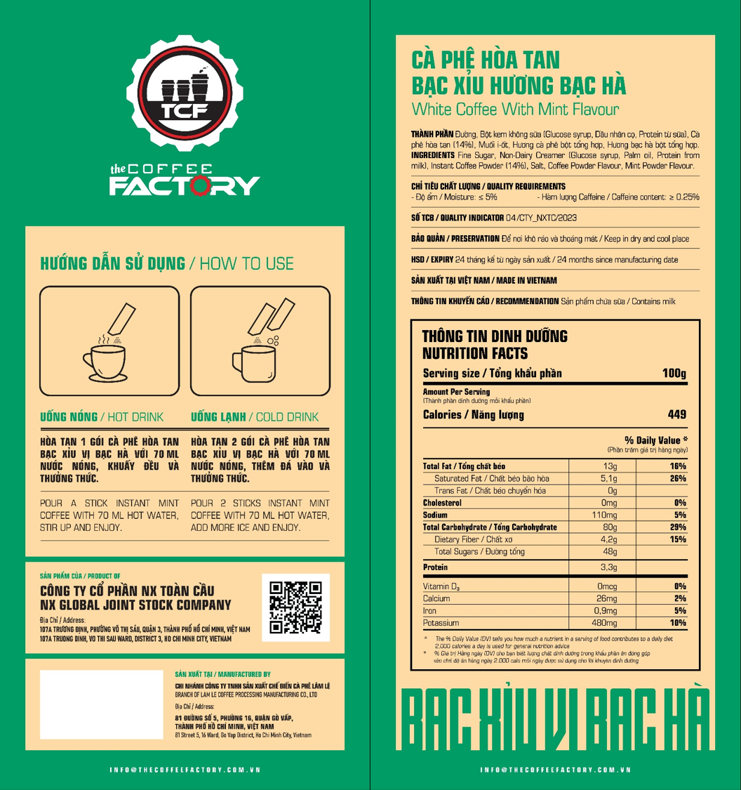 Bạc xỉu vị bạc hà hòa tan The Coffee Factory (Hộp 15 gói x 16g) Mô tả sản phẩm: Tên sản phẩm: Bạc xỉu vị bạc hà hòa tan The Coffee Factory (Hộp 15 gói x 16g) Loại sản phẩm: Cà phê hòa tan Xuất xứ: Việt Nam Trọng lượng: 15 gói x 16g Hạn sử dụng: 24 tháng kể từ ngày sản xuất Bảo quản: Bảo quản sản phẩm nơi khô ráo, thoáng mát, tránh ánh nắng trực tiếp.   Thông tin sản phẩm: Là dòng sản phẩm cà phê hòa tan đặc biệt được phát triển bởi đội ngũ The Coffee Factory. Bạc xỉu vị bạc hà The Coffee Factory (Hộp 15 gói x 16g) là sản phẩm cà phê hòa tan uống liền, biến tấu từ ly bạc xỉu thân thuộc của người Việt kết hợp cùng hương vị bạc hà thanh mát. Sản phẩm thích hợp với thực khách yêu thích sự sáng tạo, độc đáo. Mang đến trải nghiệm cực kỳ mới lạ hấp dẫn. Bạc xỉu vị bạc hà The Coffee Factory có thể uống nóng hoặc đá, ngon hơn khi dùng đá. Là sản phẩm tiện lợi không chỉ để thưởng thức mà còn thích hợp làm quà tặng cho đối tác, khách hàng, người thân, bạn bè.   Thành phần: Đường, Bột kem không sữa (Glucose syrup, Dầu nhân cọ, Protein từ sữa), Cà phê hòa tan (14%), Muối i-ốt, Hương cà phê bột tổng hợp, Hương bạc hà bột tổng hợp.   Hướng dẫn sử dụng: