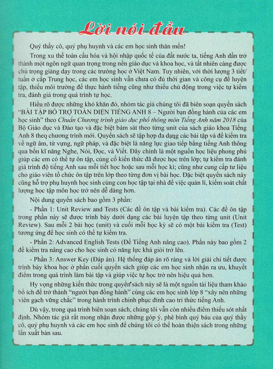 “BÀI TẬP BỔ TRỢ TOÀN DIỆN TIẾNG ANH 8 - Người bạn đồng hành của các em học sinh” theo Chuẩn Chương trình giáo dục phổ thông môn Tiếng Anh năm 2018 của Bộ Giáo dục và Đào tạo và đặc biệt bám sát theo từng unit của sách giáo khoa Tiếng Anh 8 theo chương trình mới. Quyển sách sẽ tập hợp đa dạng các bài tập và đề kiểm tra về ngữ âm, từ vựng, ngữ pháp, và đặc biệt là năng lực giao tiếp bằng tiếng Anh.