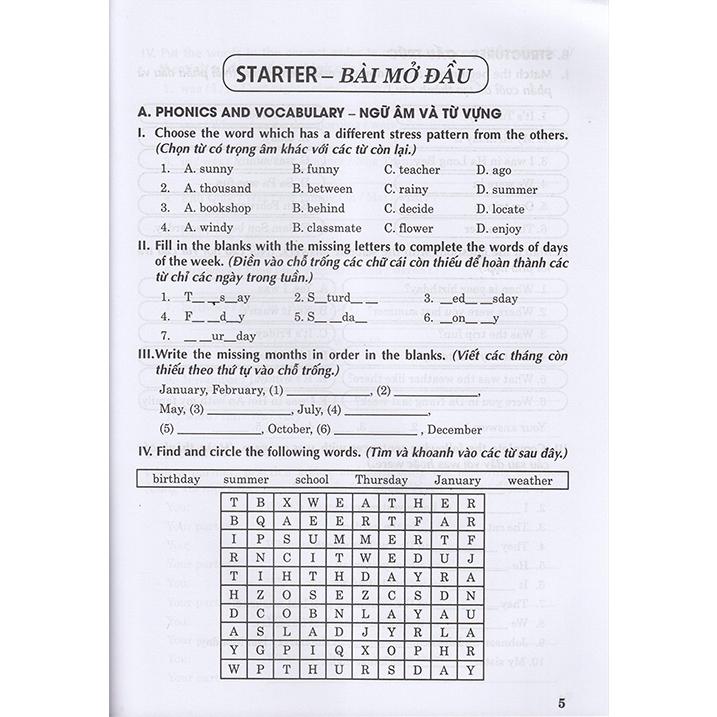 A. Pronunciation and Vocabulary: Phần này giúp các em củng cố khả năng đọc đúng trọng âm và ngữ điệu của câu, đồng thời ghi nhớ những từ vựng đã học trong sách Tiếng Anh 5 thông qua cac dạng bài tập hoàn thành câu, đọc và nối, hay tìm và khaonh tròn các từ trong ô chữ.