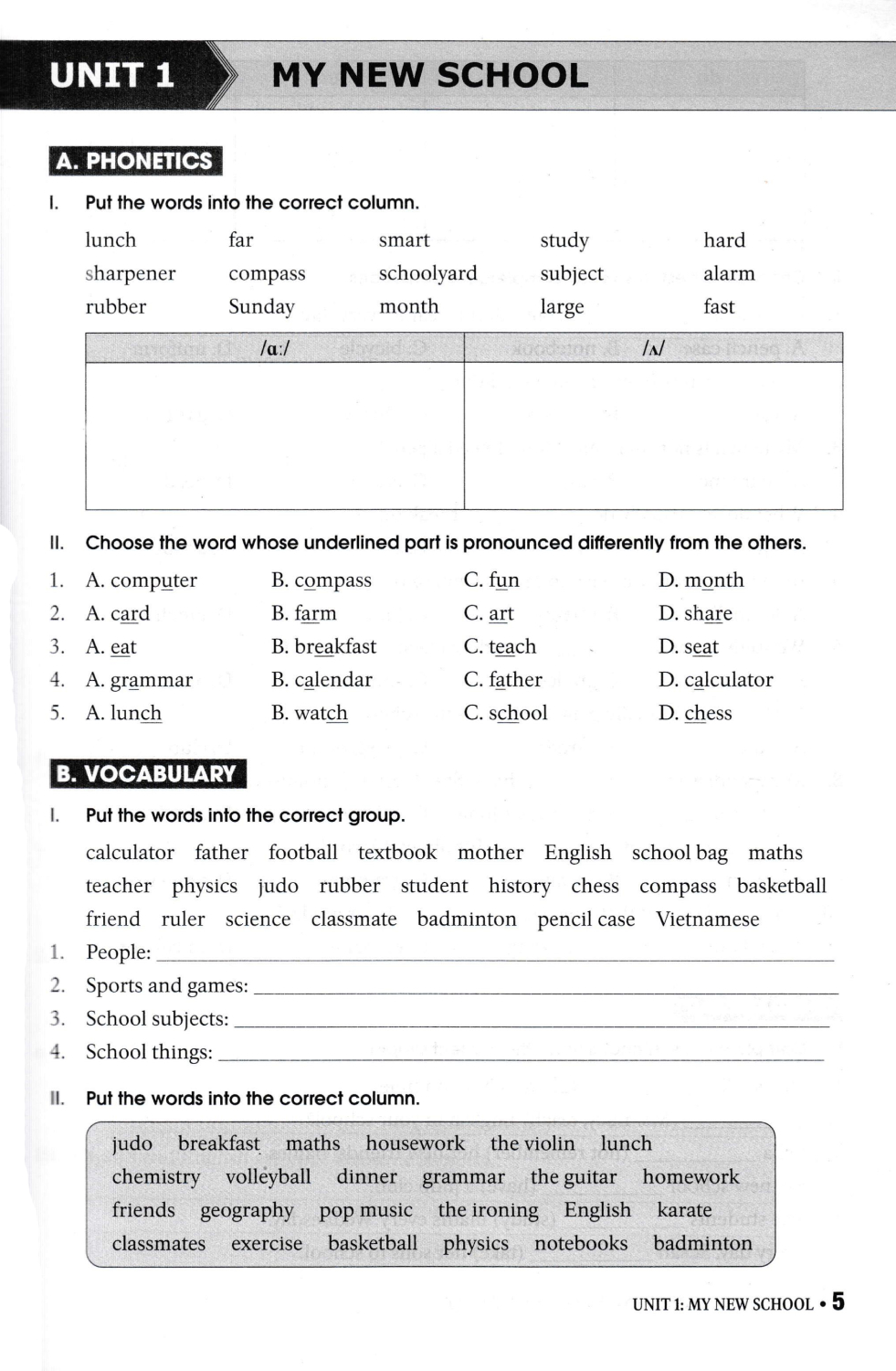 · Phần A – Phonetics: các bài tập ngữ âm giúp củng cố khả năng phát âm và khả năng nhận biết các âm được phát âm giống nhau hoặc khác nhau.