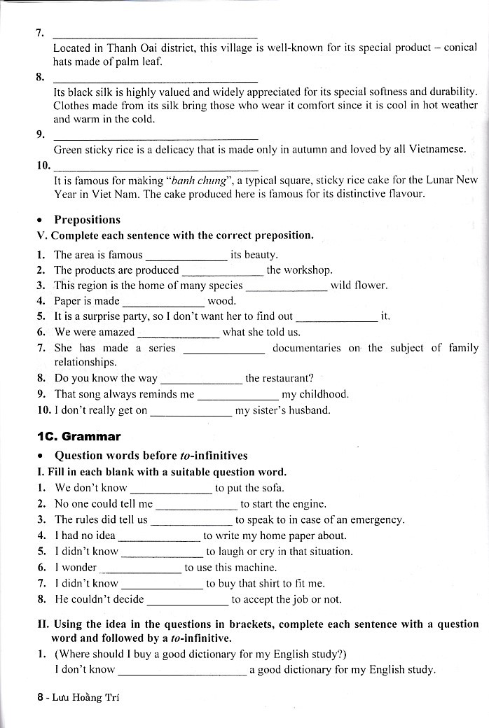 Bài tập dành cho mỗi đơn vị bài học gồm 6 phần: Phonunciation, Vocabulary, Grammar, Speaking, Reading, Writing và một bài ôn tập dưới dạng Test gồm 50 câu hỏi kiểm tra với bài tập phát triển kỹ năng trên.