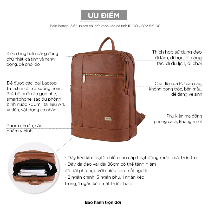 Balo laptop 15” unisex chi tiết khoá kéo cá tính IDIGO UBP2-519-00 sẽ giúp bạn: