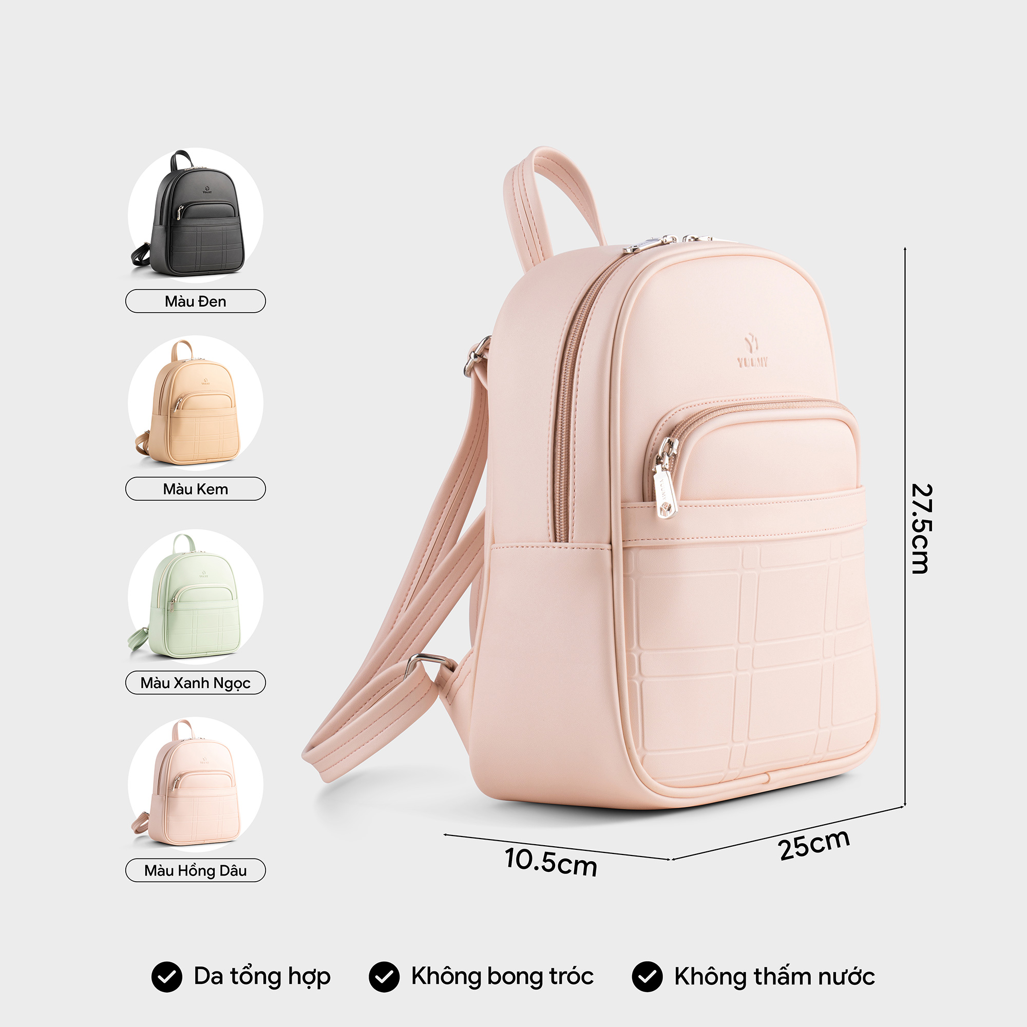 Balo da nữ Yuumy Seasand YBA99 với tone màu cơ bản theo phong cách basic giúp bạn dễ dàng phối hợp với nhiều kiểu trang phục khác nhau. Chiếc balo có kiểu dáng nhỏ gọn,