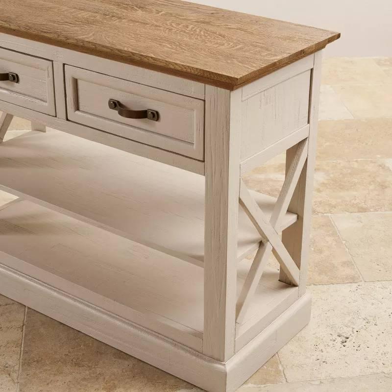 Bàn console 2 ngăn kéo Seychelles có kiểu dáng nhỏ gọn, rất thích hợp đặt ở khu vực hành lang và lối vào. Thiết kế mang đặc trưng của bộ sưu tập Seychelles với màu sơn trắng xám nhẹ nhàng, kết hợp hài hòa màu nâu tự nhiên của gỗ. Hai mặt bên với chi tiết trang trí chéo riêng biệt, đường viền trang trí bắt mắt mang lại sự tươi mới và khác biệt cho ngôi nhà của bạn. Bàn được làm từ gỗ sồi trắng Mỹ nhập khẩu, áp dụng kỹ thuật ghép mộng truyền thống vào chế tác tạo nên một tổng thể chắc chắn và bền đẹp theo thời gian. Hai ngăn kéo rộng rãi sẽ là nơi lưu trữ tiện dụng cho các vật dụng trong nhà trở nên gọn gàng và ngăn nắp.