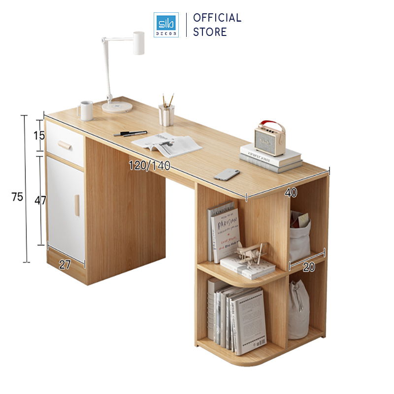 - Tên sản phẩm: Bàn làm việc kèm ngăn kéo và kệ để đồ - Chất liệu: Gỗ MDF phủ melamine cao cấp chống xước - chân bàn gỗ tự nhiên - Màu sắc: Vân gỗ sồi - Kích thước: 80/120 x 55 x 82cm (dài x rộng x cao) - Công năng: Là mẫu bàn làm việc, bàn học giúp tiết kiệm diện tích không gian phòng