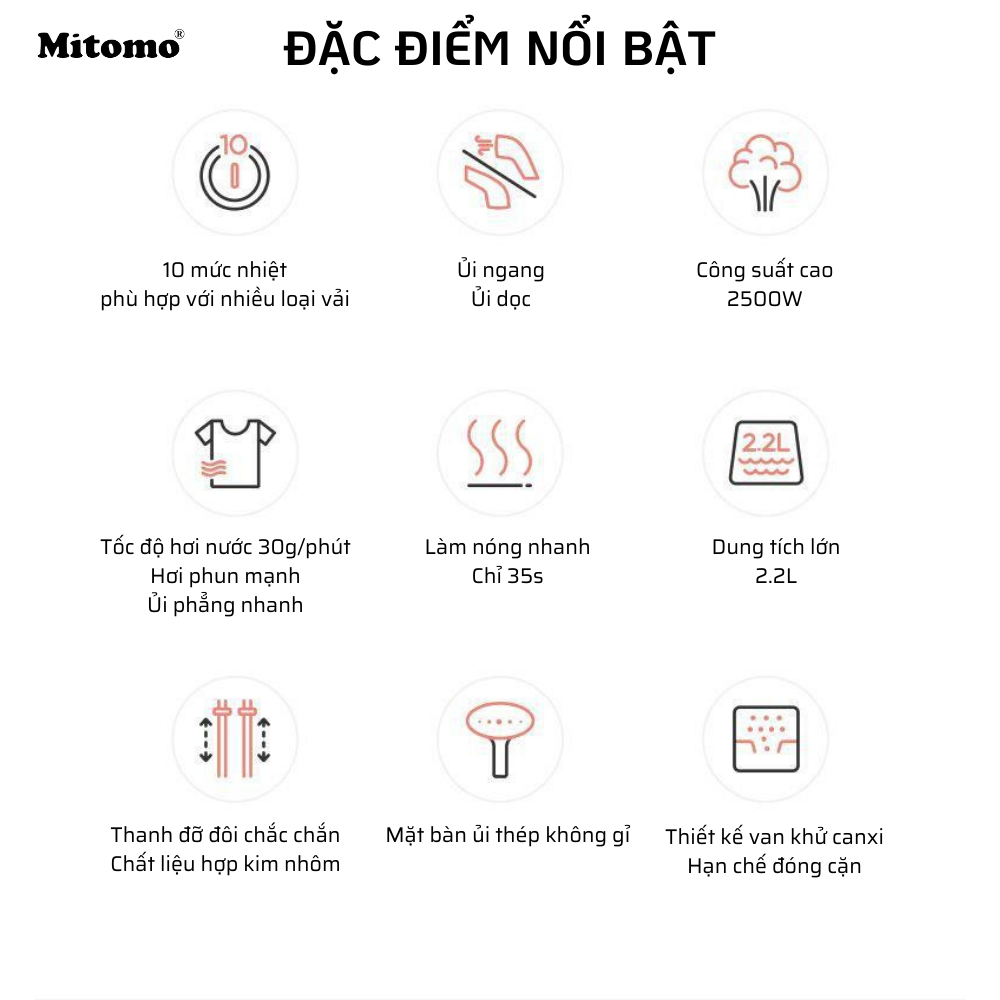 BÀN LÀ HƠI NƯỚC ĐỨNG MITOMO GC-559 - CÔNG SUẤT 2200W - BẢO HÀNH CHÍNH HÃNG 3 NĂM