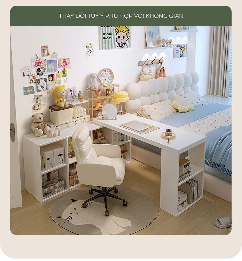 Công năng: Là chiếc bàn làm việc, bàn học vô cùng tiện dụng khi có giá sách đi kèm.