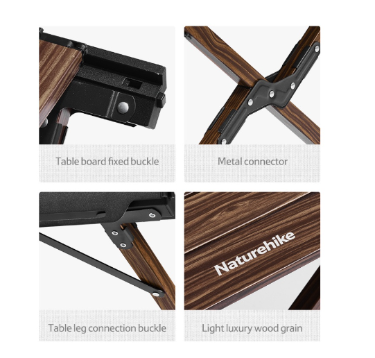 NatureHike CNH22JU043 mặt bàn vân gỗ sắc nét, tự nhiên và vô cùng sang trọng. Mặt bàn và khung bàn toàn bộ là hợp kim nhôm nhẹ, chắc chắn, ổn định không cong vênh do
