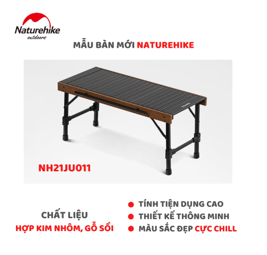 NatureHike CNH22JU038 chất liệu hợp kim nhôm vân gỗ nhẹ, bền và vô cùng sang trọng. Thiết kế khung bàn chữ X hỗ trợ ổn định hơn, tải trọng cao tới 30kg. Khung bàn có thể