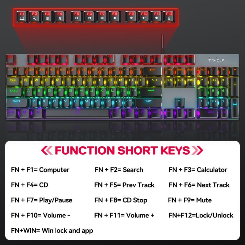 MÔ TẢ SẢN PHẨM Mô tả sản phẩm Bàn Phím cơ T-Wolf T12, Blue Switch, USB, LED, 87 Gaming bảo hành 12 tháng Bàn phím cơ T-WOLF T12 *Model: Bàn phím cơ Punk mạ điện