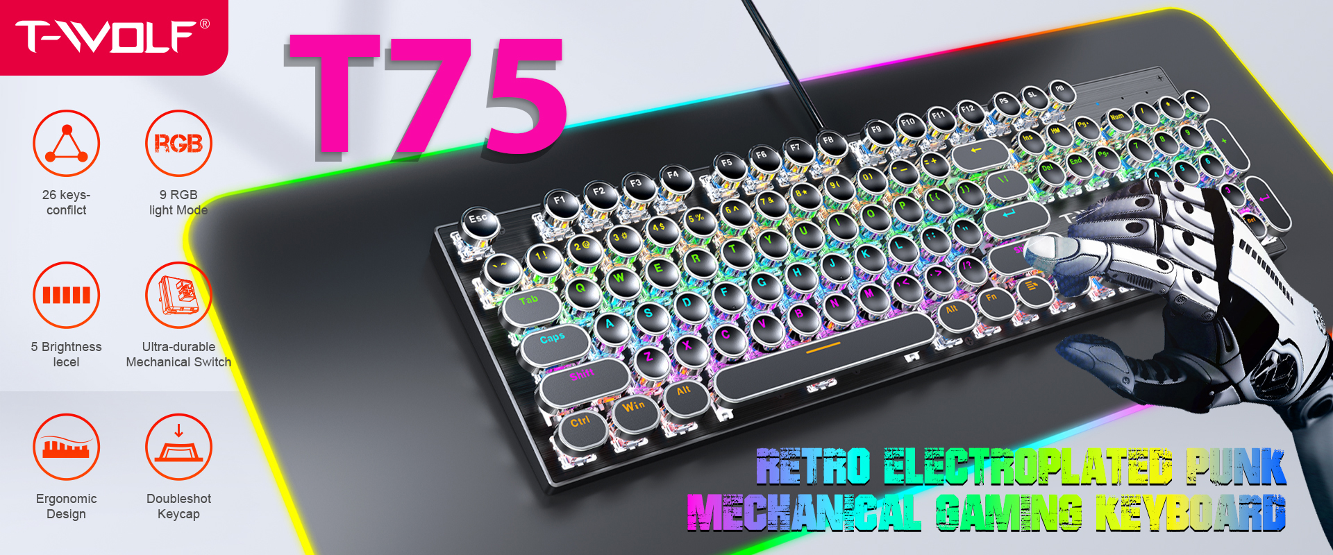 Layout 104 keycaps tròn mạ bạc thời trang T-Wolf T75 là bàn phím cơ có thiết kế ấn tượng và chất lượng cao. Từng keycap được mạ điện viền bạc, các ký tự được khắc