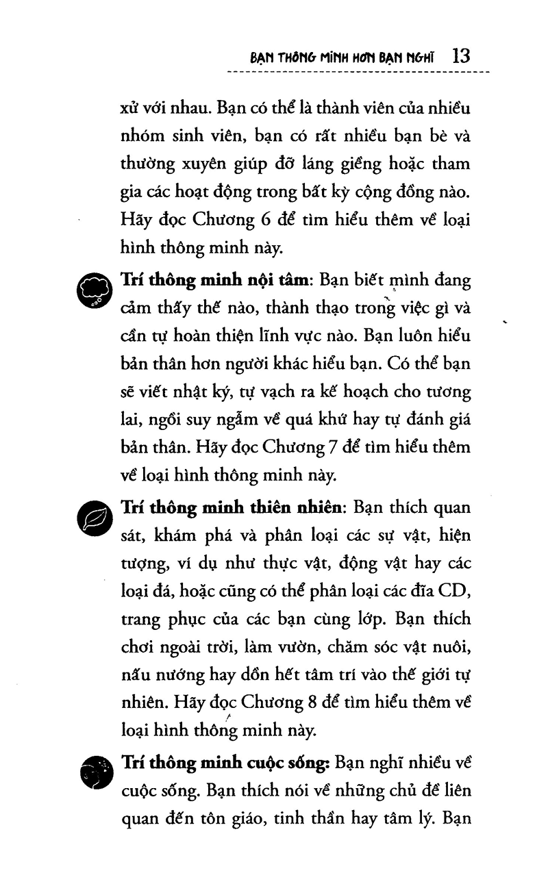 Mua tại TiktokBạn Thông Minh Hơn Bạn Nghĩ Bạn có nghĩ mình thông minh không? Và trí thông minh là gì? Nhiều người tin rằng thông minh là phải đạt điểm tốt hoặc giành thứ hạng cao ở trường học. Hoặc thông minh là làm được những việc như: Đọc thật tốt Giải toán nhanh Học thuộc lòng giỏi Những điều này có thể khiến bạn ngạc nhiên bởi trí thông minh có thể biểu hiện theo nhiều cách thức khác nhau – trong nghệ thuật, âm nhạc, thể thao, trong cách cảm nhận, sự hiểu biết về thiên nhiên và sống hòa hợp với những người xung Bạn thông minh hơn bạn nghĩ sẽ giúp bạn khám phá ra rằng có vô vàn cách biểu hiện trí thông minh. Trong gần một thế kỷ qua, giới chuyên môn vẫn sử dụng các bài kiểm tra IQ để đo chỉ số thông minh. IQ là từ viết tắt của Intelligence Quotient, là thước đo trí thông minh của con người thông qua một bài kiểm tra. Bài kiểm tra này yêu cầu bạn phải giải toán, định nghĩa từ, tạo mẫu thiết kế, nhắc lại các con số theo trí nhớ và một số bài tập khác nữa. Có thể bạn cũng từng làm một bài kiểm tra IQ giống như vậy. Nhiều người nghĩ rằng kiểm tra chỉ số IQ là cách tốt nhất để đo trí thông minh của con người. Tuy nhiên, kiểm tra IQ không phải là cách hoàn hảo vì có rất nhiều thứ không thể phản ánh qua các bài kiểm tra. Chúng không thể dự đoán được khi trưởng thành bạn sẽ làm gì hoặc trở thành người như thế nào. Và các câu hỏi kiểm tra cũng thường chịu ảnh hưởng bởi định kiến hoặc quan điểm của người ra đề. Bên cạnh đó, không có bài kiểm tra nào là toàn diện. Hệ thống câu hỏi thường không thể làm bộc lộ những khả năng khác nhau của bạn. Nói chung, các bài kiểm tra IQ thường chú trọng từ ngữ hoặc các con số, vì vậy sẽ làm xao lãng những thứ quan trọng khác như khả năng âm nhạc, nghệ thuật, tự nhiên hay xã hội. Thời gian gần đây, nhiều nhà nghiên cứu nghi ngờ quan điểm cho rằng kiểm tra IQ là thước đo trí thông minh tốt nhất. Một trong số đó là nhà tâm lý học, Tiến sỹ Howard Gardner thuộc Đại học Harvard. Những công trình nghiên cứu của ông đã đưa ra một cái nhìn hoàn toàn mới về vấn đề “Thế nào là thông minh?”