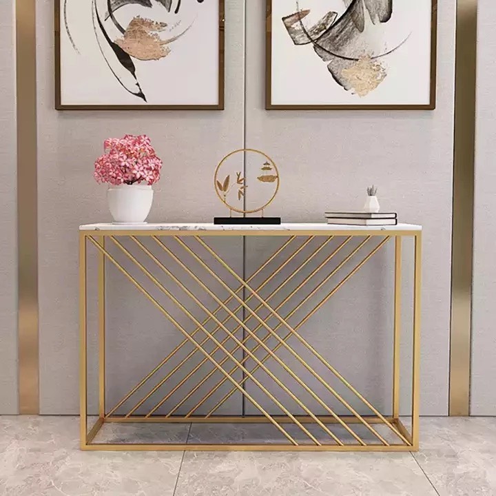 Bàn console, bàn trang trí mặt đá trắng khung sơn vàng CSTCT019 với điểm nhấn khung sắt sơn màu vàng kết hợp mặt đá trắng vân tạo toát lên vẻ đẹp sang trọng giúp nâng tầm giá